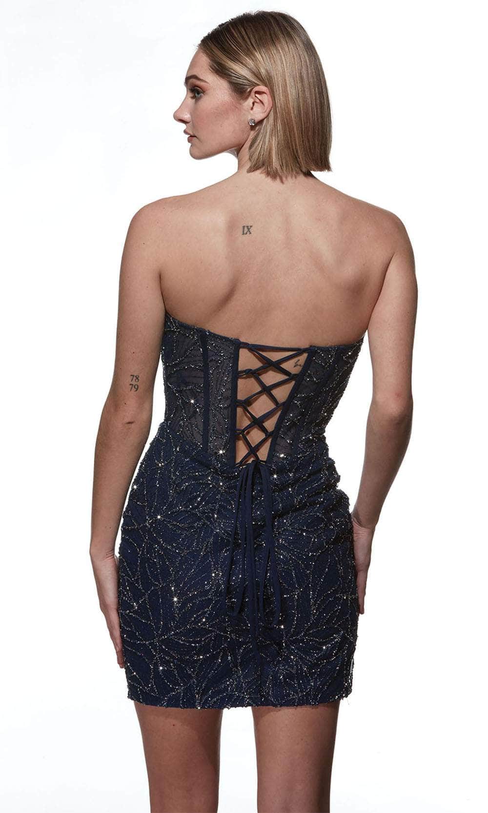 Dazzle in this glamorous strapless Alyce Paris 4861, embellished with shimmering glitters that catch the light with every step. The boned structured bodice offers a flattering and secure fit, while the sweetheart neckline adds a touch of romance and elegance. A concealed zipper closure ensures a seamless finish, and the lace-up tie at the back allows for a customized, perfect fit. The short-length sheath silhouette skirt hugs your curves for a sleek, sophisticated look, making this Alyce Paris 4861 a stunning choice for any special occasion where you want to shine. Models are wearing Raspberry and Navy colors.
