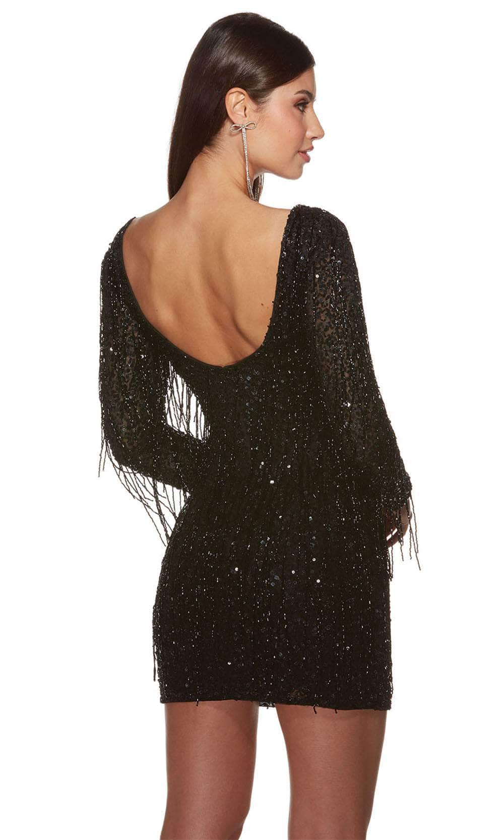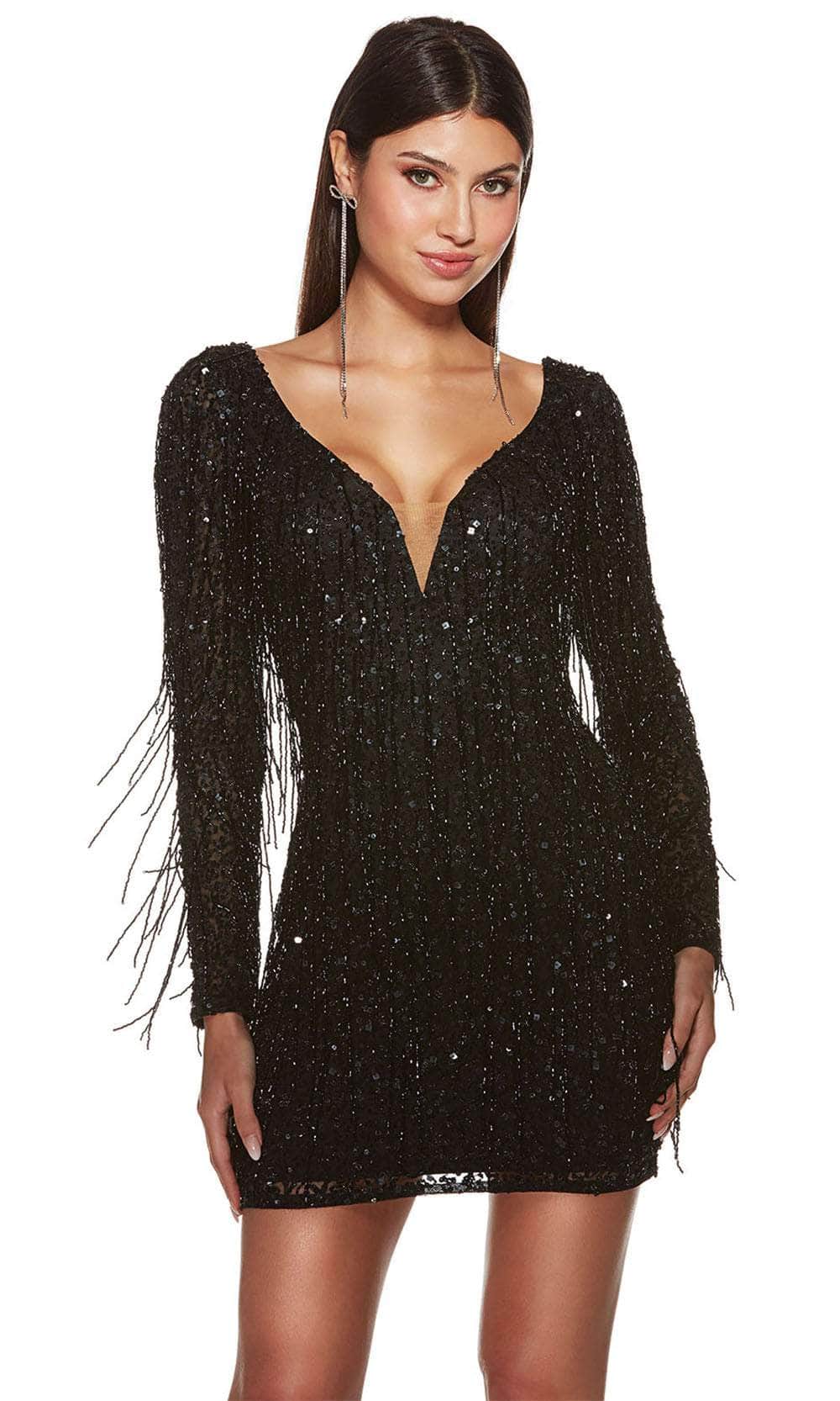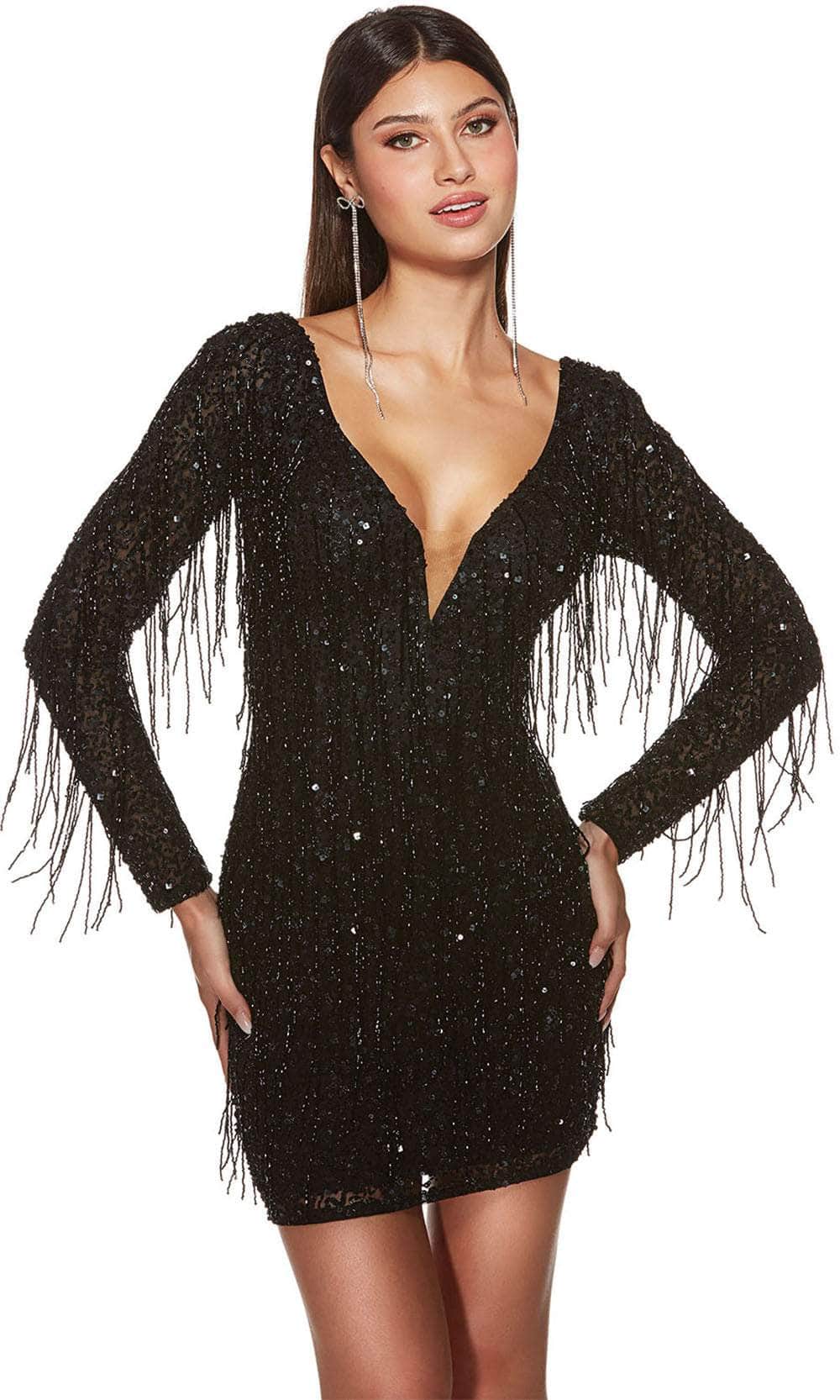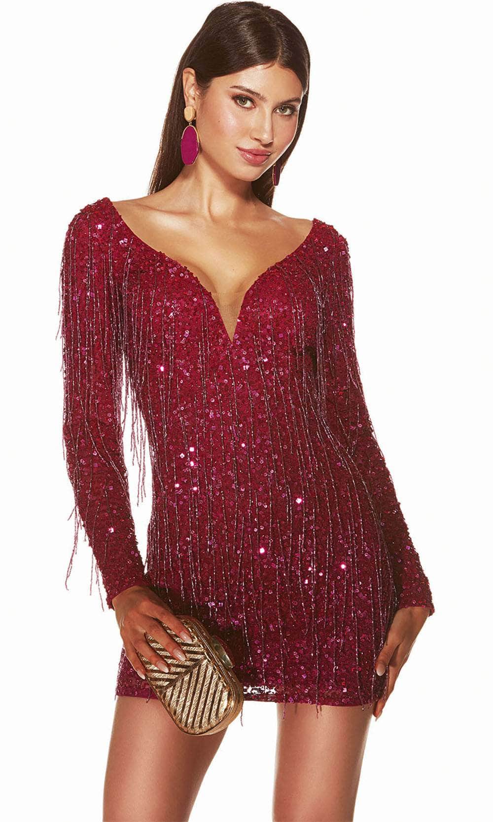 Standout among the fabulous crowd as all eyes focus on you in this glamorous Alyce Paris 4873 cocktail dress. This dress will surely complement your beauty with its endearing plunging V-neckline on a fitted bodice, featuring charming long sleeves for added sophistication. It also exhibits an alluring scoop back that is enclosed by a zipper for a polished finish. Additionally, the top displays a sheer inset on the chest, while the skirt shows a sheath silhouette that is evident down to the mid-thigh. It is also entirely designed with fringes and beads, heightening your overall appeal. Take your seat on the throne in a queenly Alyce Paris 4873 masterpiece. Models are wearing Black, Emerald, and Sangria colors.