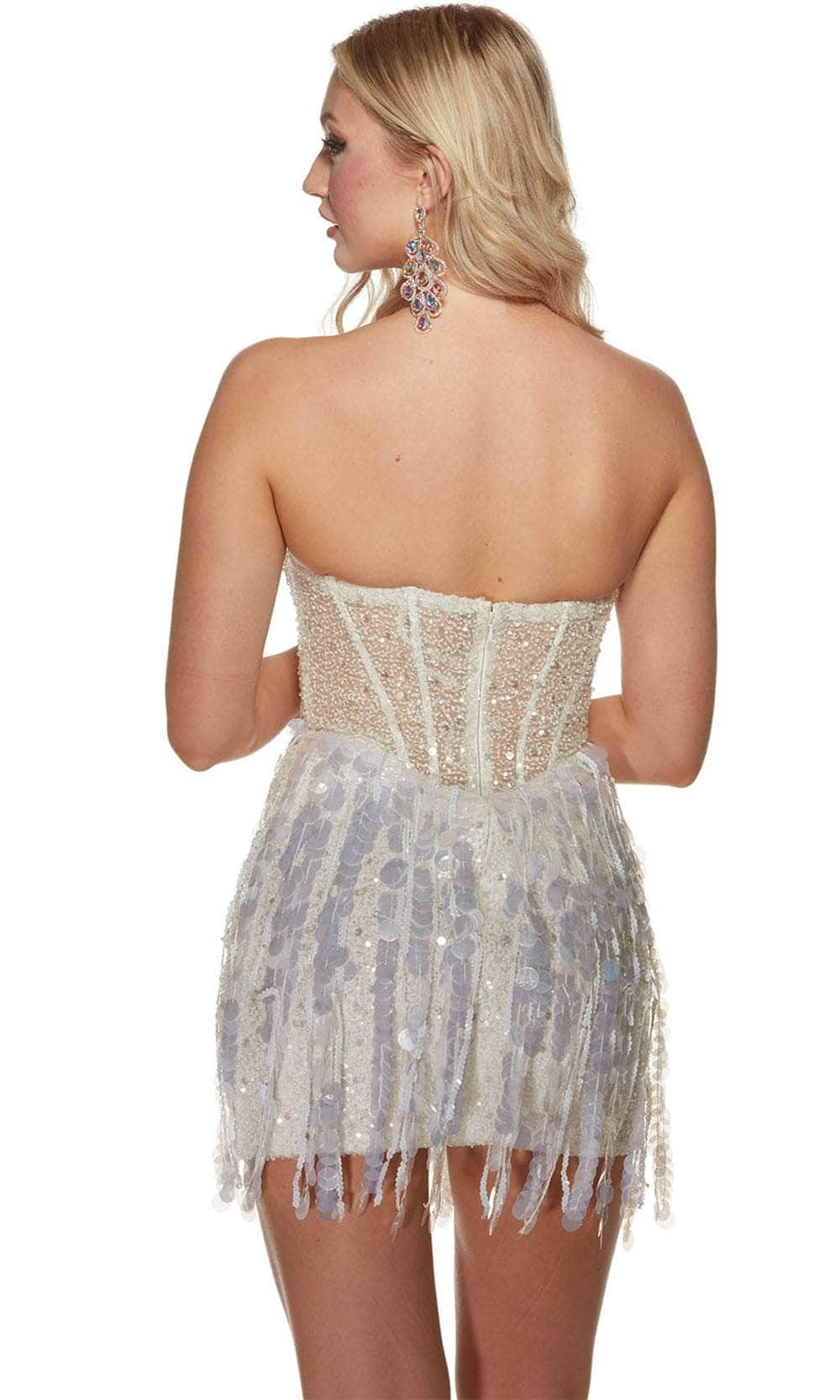 Radiate confidence and style in this show-stopping Alyce Paris 4876, a strapless masterpiece. The sheer corset bodice, embellished with paillettes and hot fix detailing, offers a luxurious and glamorous feel. A back zipper closure ensures a flawless fit, while the short-length sheath skirt, adorned with fringes all over, adds a playful and energetic touch. Perfect for parties, formal events, or a night out, this Alyce Paris 4876 is designed to dazzle and turn heads with its stunning combination of elegance and fun. Models are wearing Black and Ivory colors.