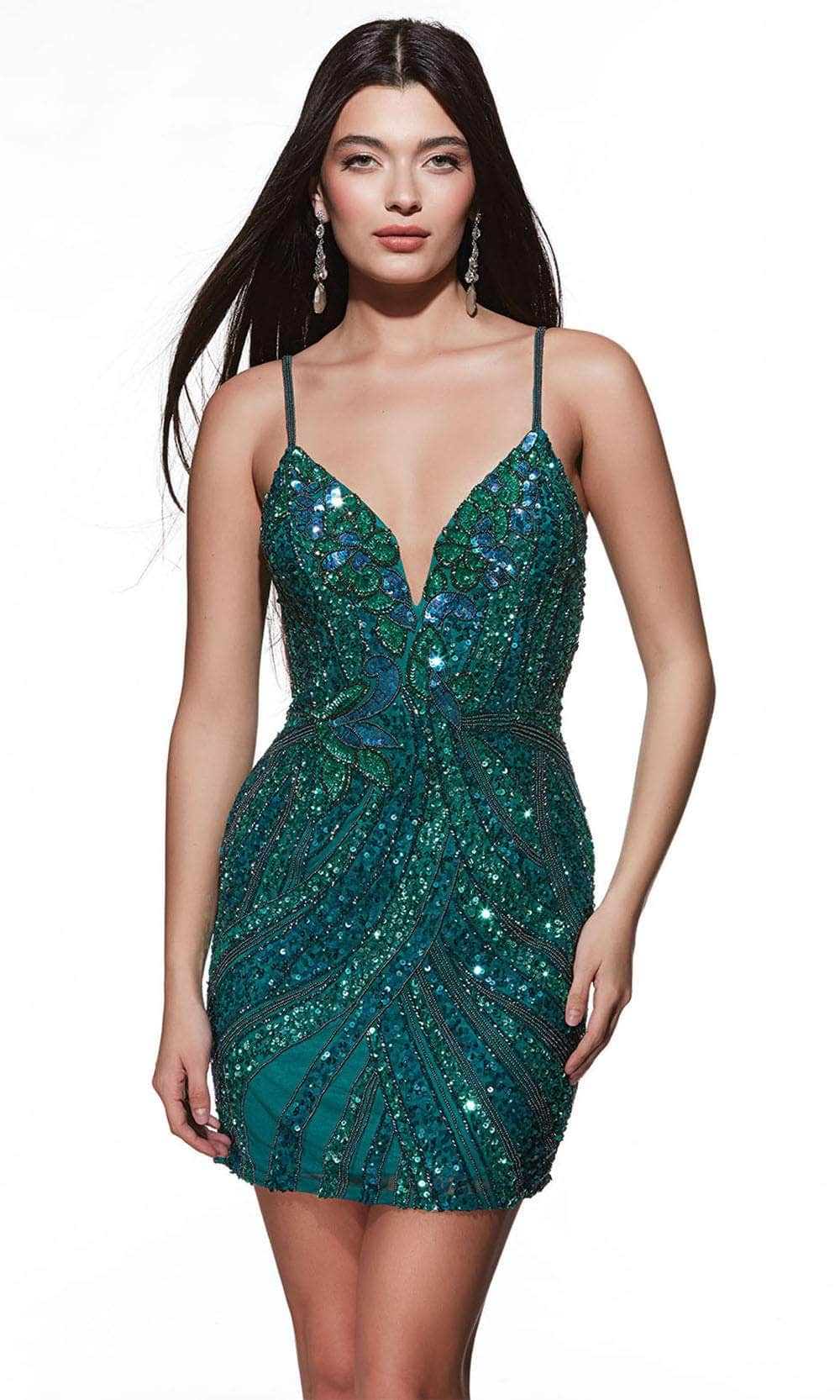 Shine bright and make a statement in the Alyce Paris 4879 dress. Designed with a sleeveless cut and adjustable spaghetti straps, this dress exudes comfort and style. The luxurious hand-beaded and intricate sequin embellishments add an irresistible sparkle. Featuring a plunging V-neckline and a mid-open back, it delivers just the right amount of allure. The skirt sculpts a sheath silhouette that elevates and hugs your shape, ending in a sultry mid-thigh hem. Be the life of the party by wearing the Alyce Paris 4879 masterpiece. Models are wearing Black-Gold, Gold, Jade, Neon Pink, and Periwinkle-Lilac colors.