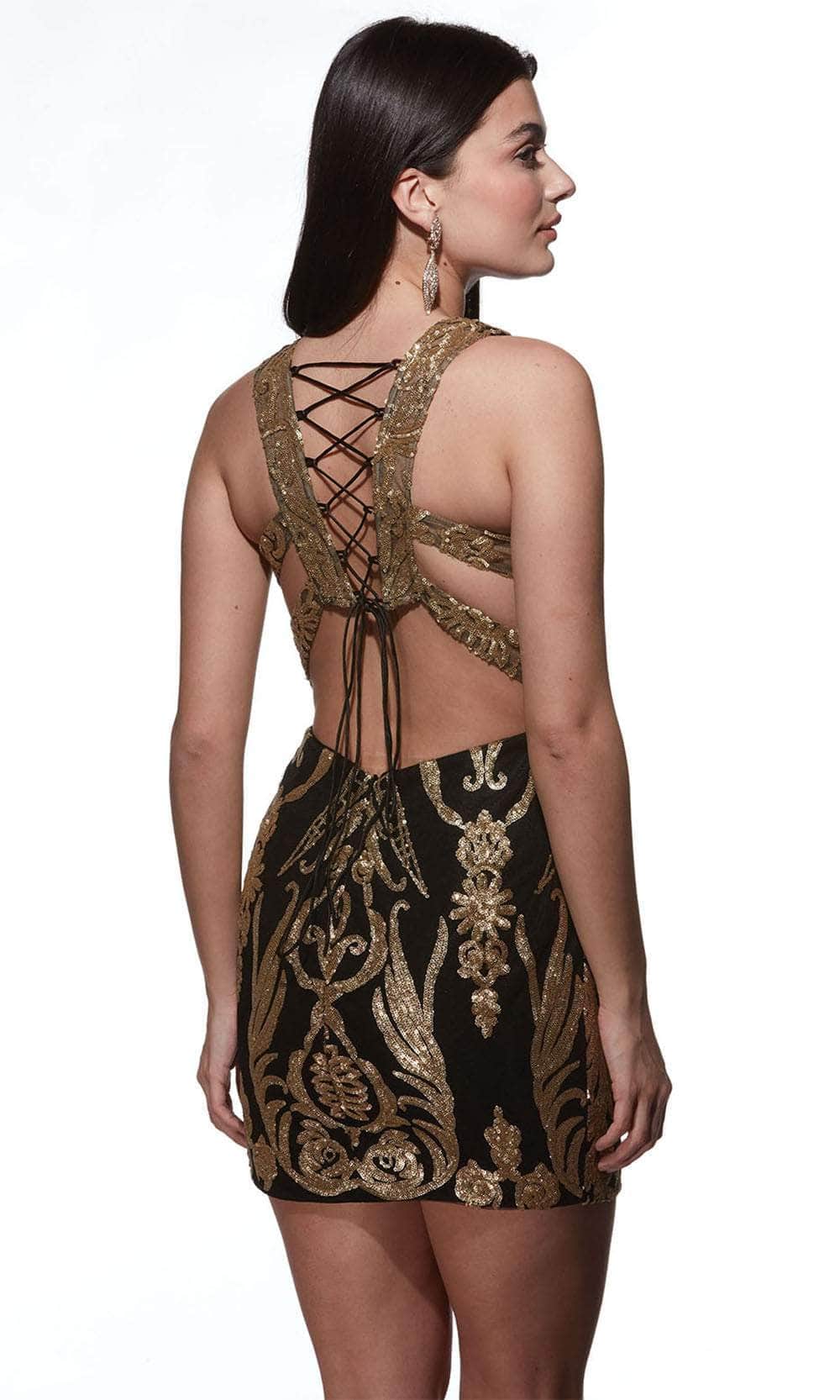 Steal the show in this stunning Alyce Paris 4894 dress. The patterned sequin embellishments bring sparkle and elegance, while the plunging V-neckline adds allure. With wide straps, a fitted sheath silhouette, and a strappy lace-up back design, this dress is a perfect blend of charm and sophistication. Make your next event unforgettable in this captivating Alyce Paris 4894 design. Models are wearing Barbie Opal, Black-Gold, and Blue-Lavender colors.