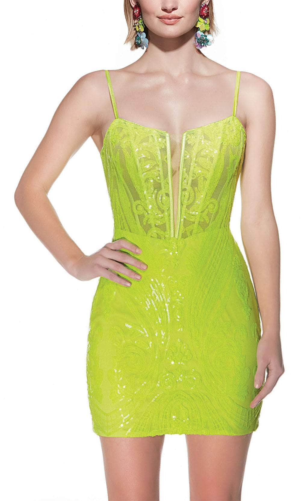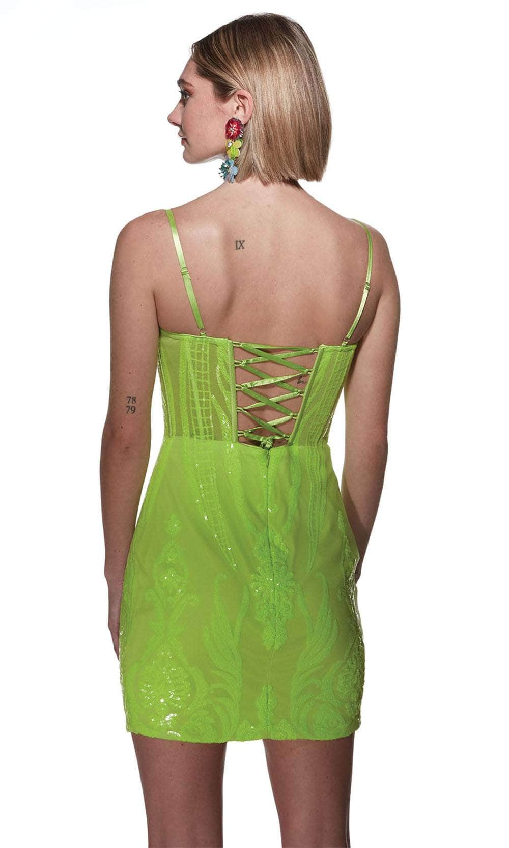 Create an unforgettable impression as you enter the hall in this Alyce Paris 4901 masterpiece. Adorned with vintage-patterned sequins, this dress shimmers beautifully under the light. To enhance its romantic appeal, it features a plunging v-neckline, lace-up back and spaghetti straps. The sheer corset bodice with visible boning details provides a structured foundation. The skirt reaches the mid-thigh to perfectly for show off your sexy legs and sculpts a sheath silhouette that accentuates your curve. Capture hearts in this enduringly beautiful dress from Alyce Paris 4901. Models are wearing Barbie Opal, Electric Lime, and Royal colors.
