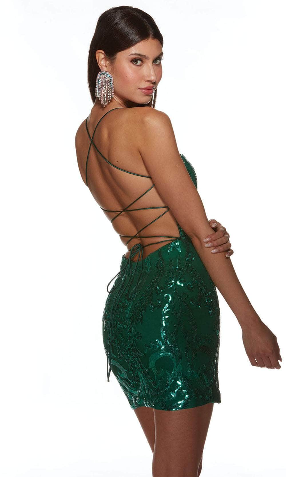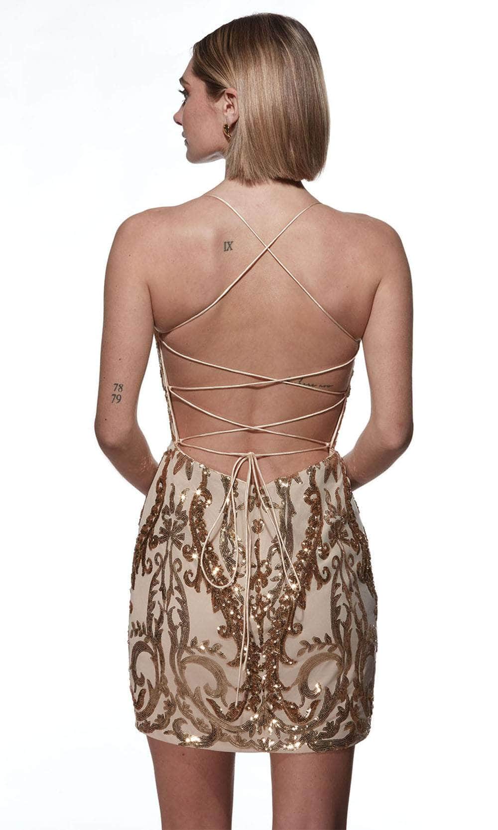 Make your party truly special with this ensemble from Alyce Paris 4903. Intricately embellished in vintage patterned sequins, this sleeveless piece will stand out and make a lasting impression. Spaghetti straps highlight the shoulders and flow into the open back, creating a fashionable lace-up tie detail. Its concealed back zipper closure guarantees a comfy fit. The mid-thigh length and sheath skirt give a sophisticated and timeless appeal. Glow with ethereal charm in this Alyce Paris 4903 masterpiece. Models are wearing Cerulean Blue, Gold, and Jade colors.