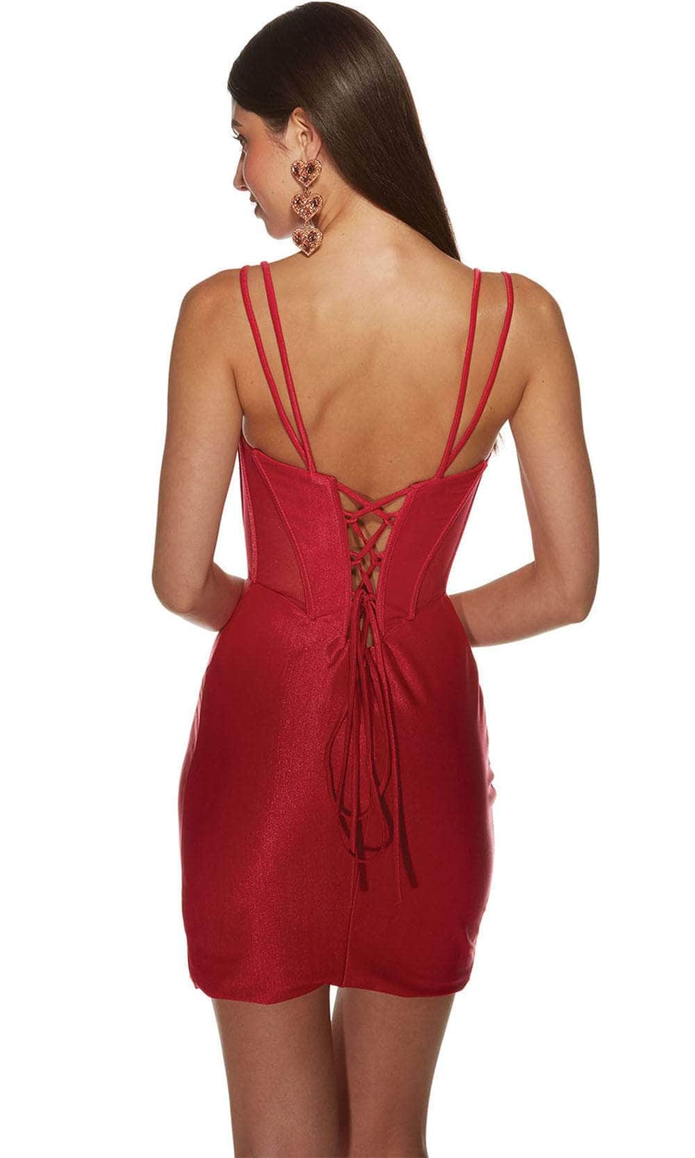 Astonish them with the beauty of this Alyce Paris 4917 cocktail dress. Designed to showcase your figure, this shiny jersey dress has exposed boning on the corset bodice ensuring you will be the center of attention at any event. It has double spaghetti straps and a sweetheart neckline for a refined look. The striking open back features a lace-up tie closure, providing a secure and adjustable fit for your comfort. Opening a small side slit, the skirt hugs your curves with its sheath silhouette and finishes with a flirty short hemline. Be the embodiment of pure feminine flair in this Alyce Paris 4917 masterpiece. Models are wearing Ocean, and Red colors.