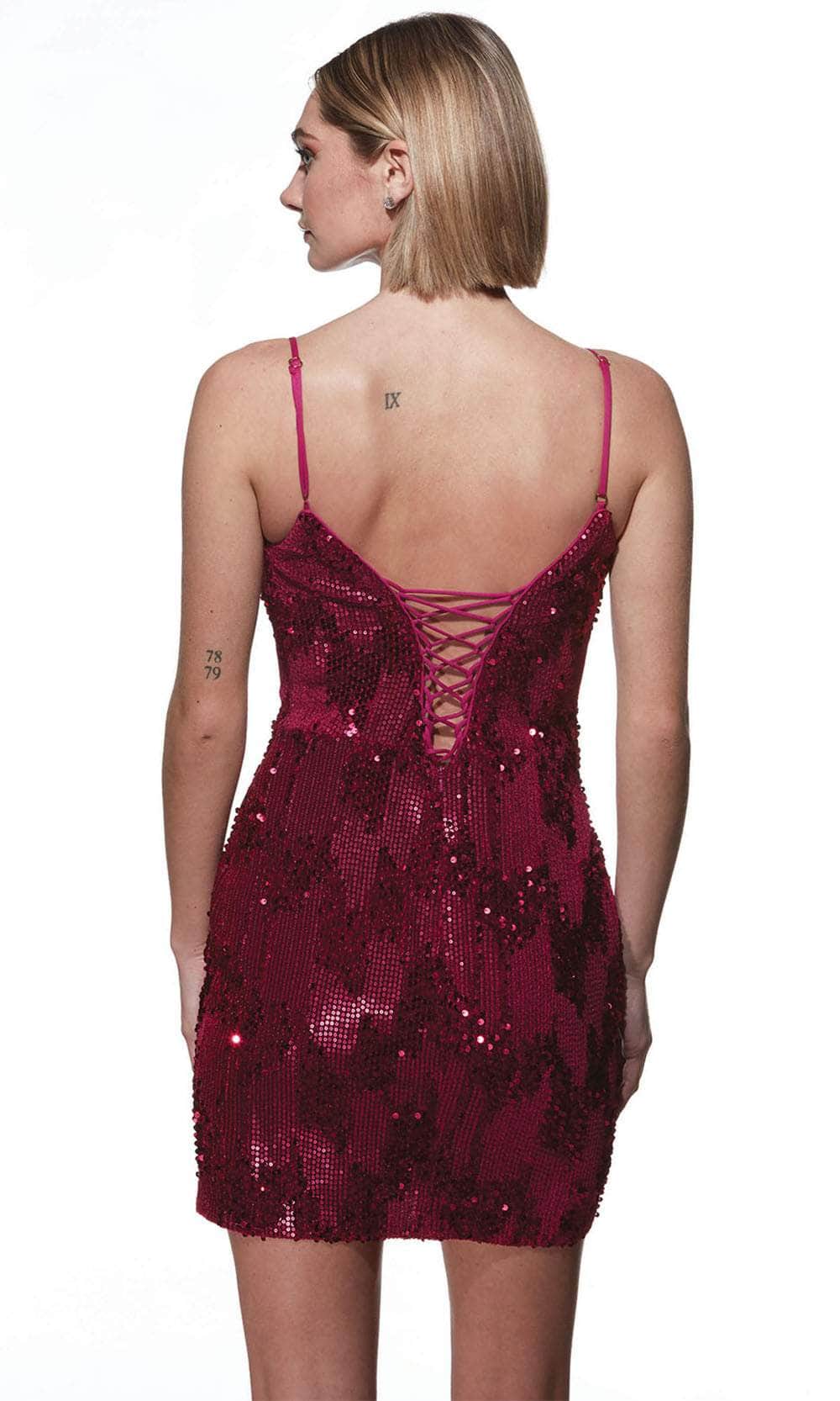 Reveal your inner enchantress by wearing the radiant Alyce Paris 4932 dress. This sleeveless piece is made from luxurious velvet fabric with an all-over sequins decoration that will leave onlookers in awe. An adjustable spaghetti straps outline the shoulder and deliver comfortable support. The plunging v-neckline exudes elegance, while the daring low V-shaped back has lace-up tie closure that adds style and allows you to customized the fit. The skirt falls just above the knee, creating a sheath silhouette that accentuates the wearer natural curves. The Alyce Paris 4932 creation is just the right dress to make the room shine. Models are wearing Dragonfly, and Raspberry colors.