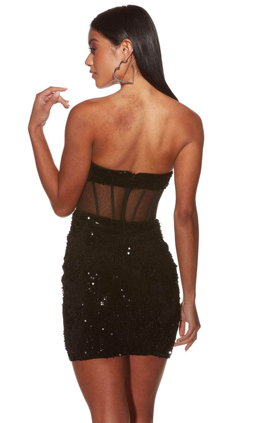 Own your spotlight moment with confidence in this Alyce Paris 4934. Crafted from velvet sequins fabric, this strapless dress is a vision of luxury and allure. This design has strapless form and sweetheart neckline that create a stunning focus on your shoulders and collarbone. The boning detail in the illusion corset bodice provides a perfect foundation, while the midrise back has hidden zipper closure for a secure fit. The skirt displays a sheath silhouette that enhances its overall chicness, culminating in short hemline. The Alyce Paris 4934 creation is a must-have for those who crave elegance, making it perfect for any special event. Model is wearing Black color.