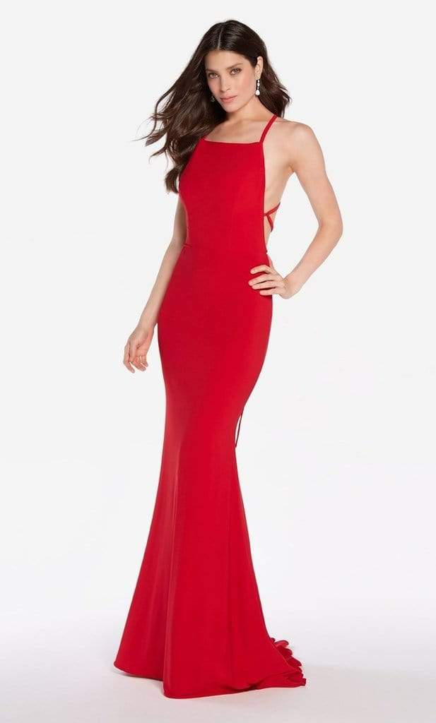 Elegantly crafted in soft jersey fabric, this evening dress shows a square neckline framed with spaghetti straps on a sleeveless bodice. Highlighted with crisscrossed straps on a plunging low open back, features a lace up design that lures the eyes to glimpse at your radiant skin. The sheath skirt follows the natural curve as it brushes the floor at a full-length hem and a subtle train. Model represents the dress in Red and Black colors.