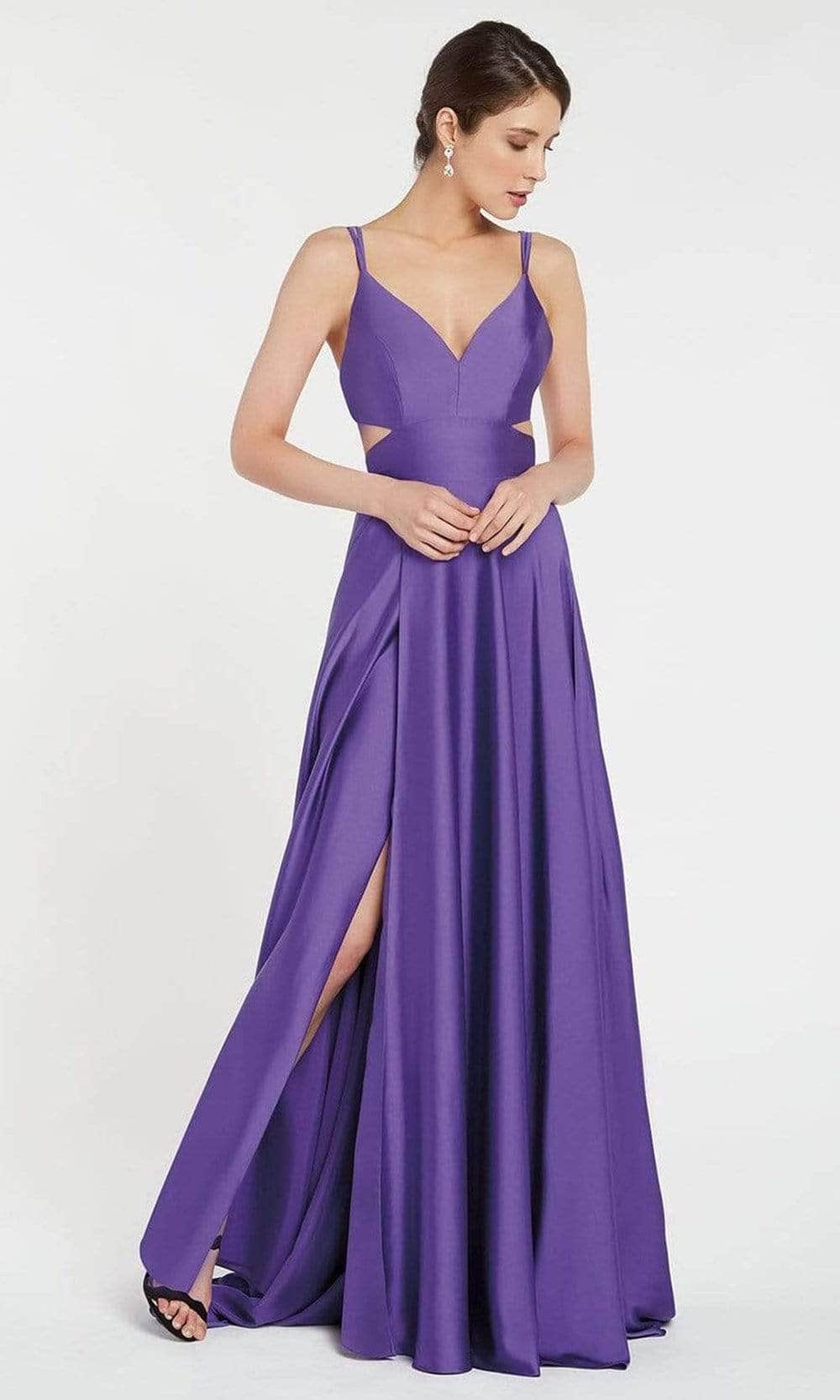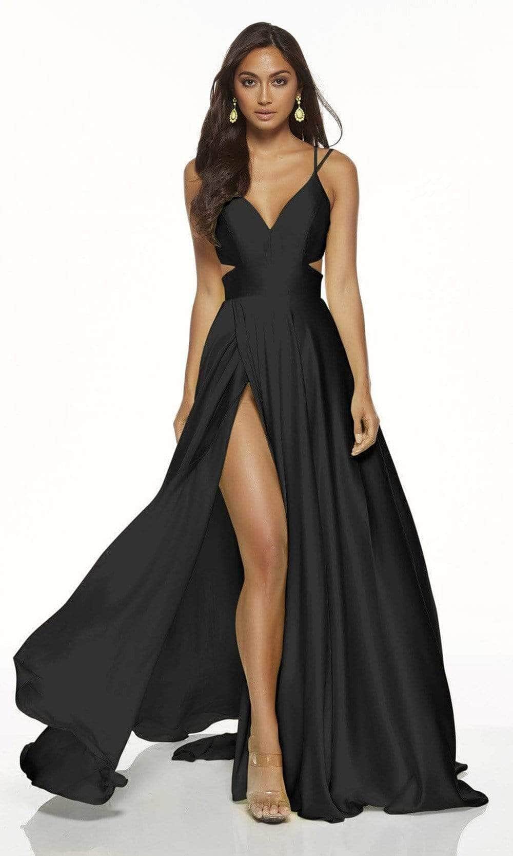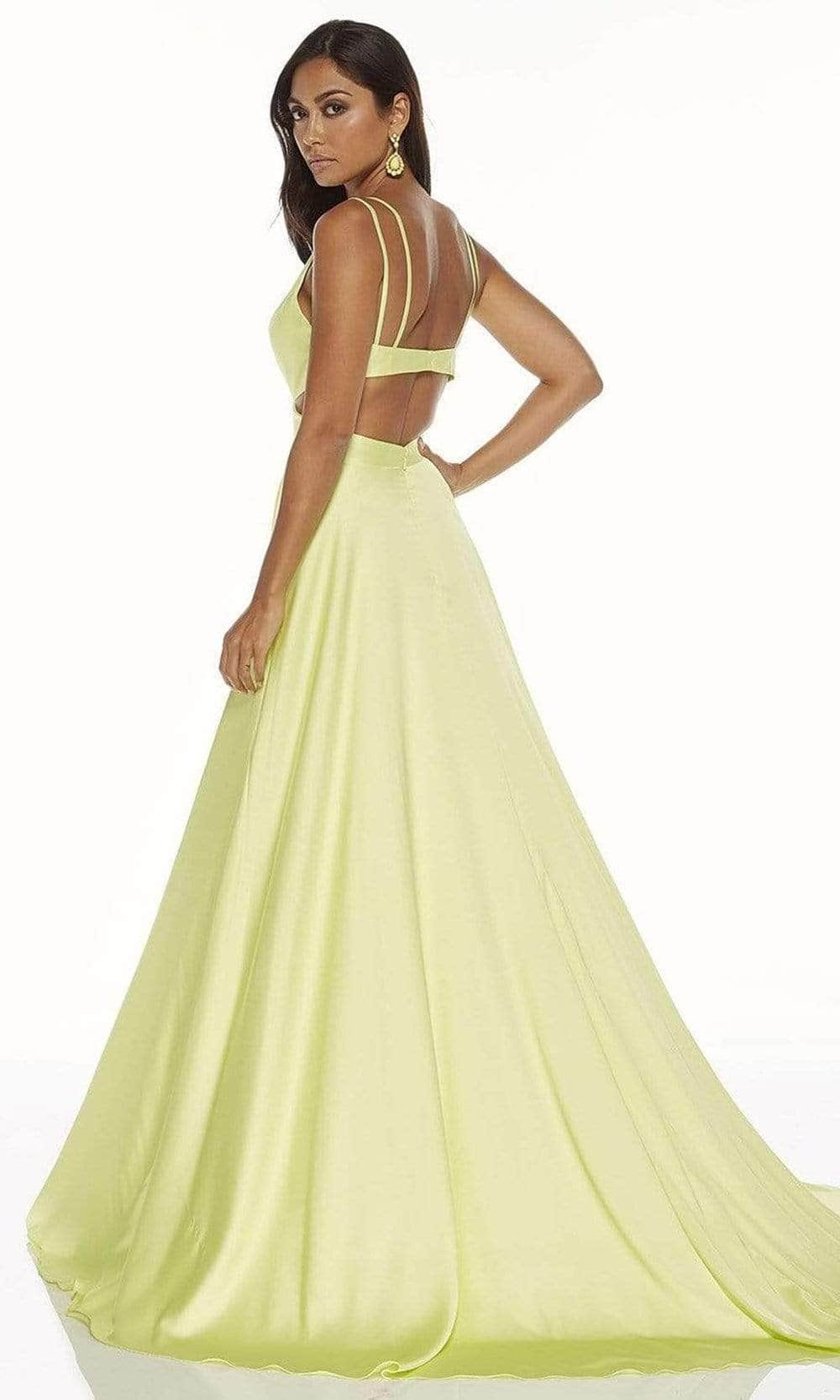 Display your elegant style as you wear this Alyce Paris 60453 masterpiece. Stunning in a sleeveless style, the dress displays a deep v-neckline supported by dual spaghetti straps. It is sculpted with a princess seam, and has a stylish cutout on the side waist that continues at the back for a breathtaking look. Flattering on all figures, the skirt flares an A-line silhouette and has pleated detail for added volume. The seductive thigh-high leg slit and sweeping train that trails behind finishes this look. You are bound to capture attention in this Alyce Paris 60453 creation. Models are wearing Limoncello, Blush, Midnight, Purple, Royal, Sage Green, Black, and Rosewood colors.