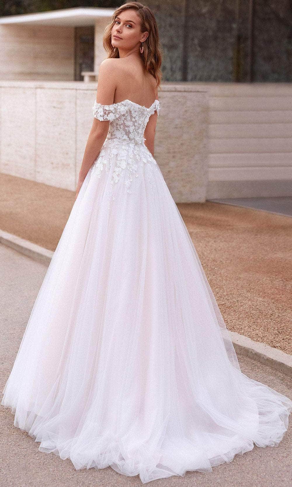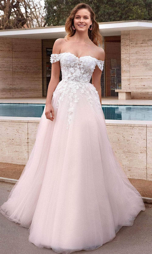 | Details: | Off-shoulder straps, Lace, Appliques, Sheer, Corset boning, Mid-open back, Zipper closure, Sweep train |