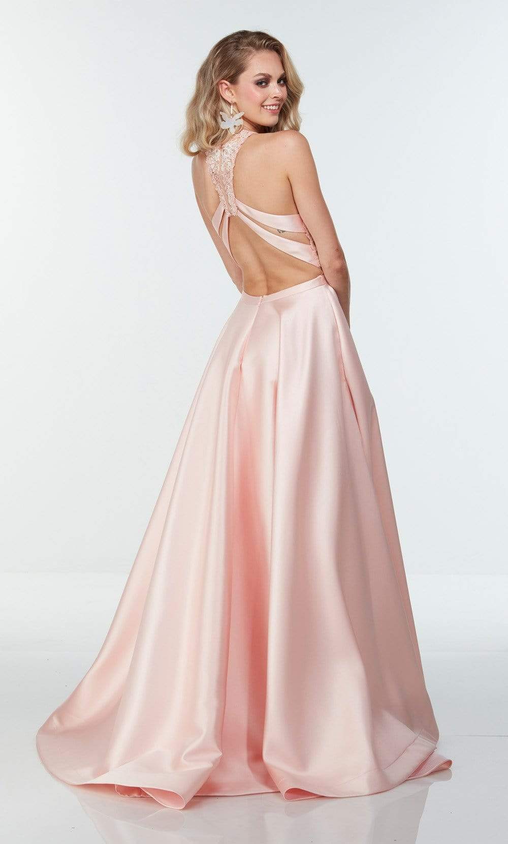 Mesmerize everyone in this charming gown by Alyce Paris 61081. This two piece set showcases a fitted sheer crop top with lace embellished and scallop edges. This gown features a sleeveless, halter neckline complemented with racerback and cutout detail. The skirt parades a ballgown silhouette which gracefully flares to the floor, completed with a sweep train. This Alyce Paris style is a sure standout on your next evening social event. Model is wearing French Pink color.