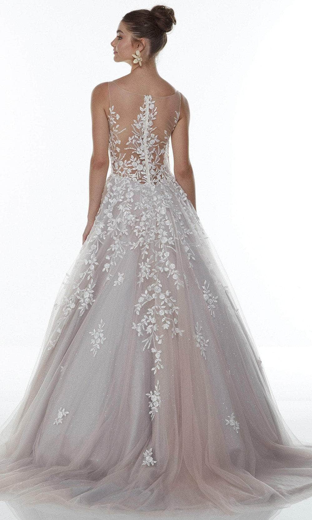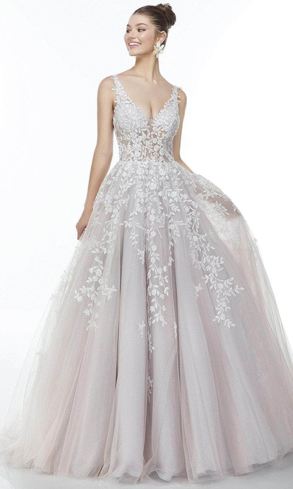 Promote attention-grabbing style in this stunning Alyce Paris 61106 creation. This mesh gown flatters in a sleeveless fitted bodice with a low-cut scoop neckline. It is embellished with lace appliques that extends to the skirt and to the sheer back and it is secured with a zipper closure. The skirt is tailored in a A-line silhouette and finishes in a sweep train for that grand look. Get a timeless and trendy look in this Alyce Paris design. Model is wearing the Mademoiselle/Light Silver color.