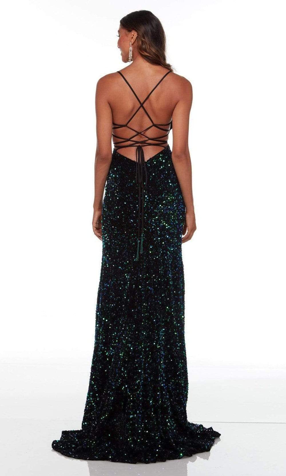 Experience an enchanted evening in this Alyce Paris 61186 creation. Accented with sequins allover its length, this beauty charms with a scoop neckline and spaghetti straps. Beautifully laced at the back and accented with a slit, the skirt streams into a sweeping train. Take your time to shine in this Alyce Paris masterpiece.