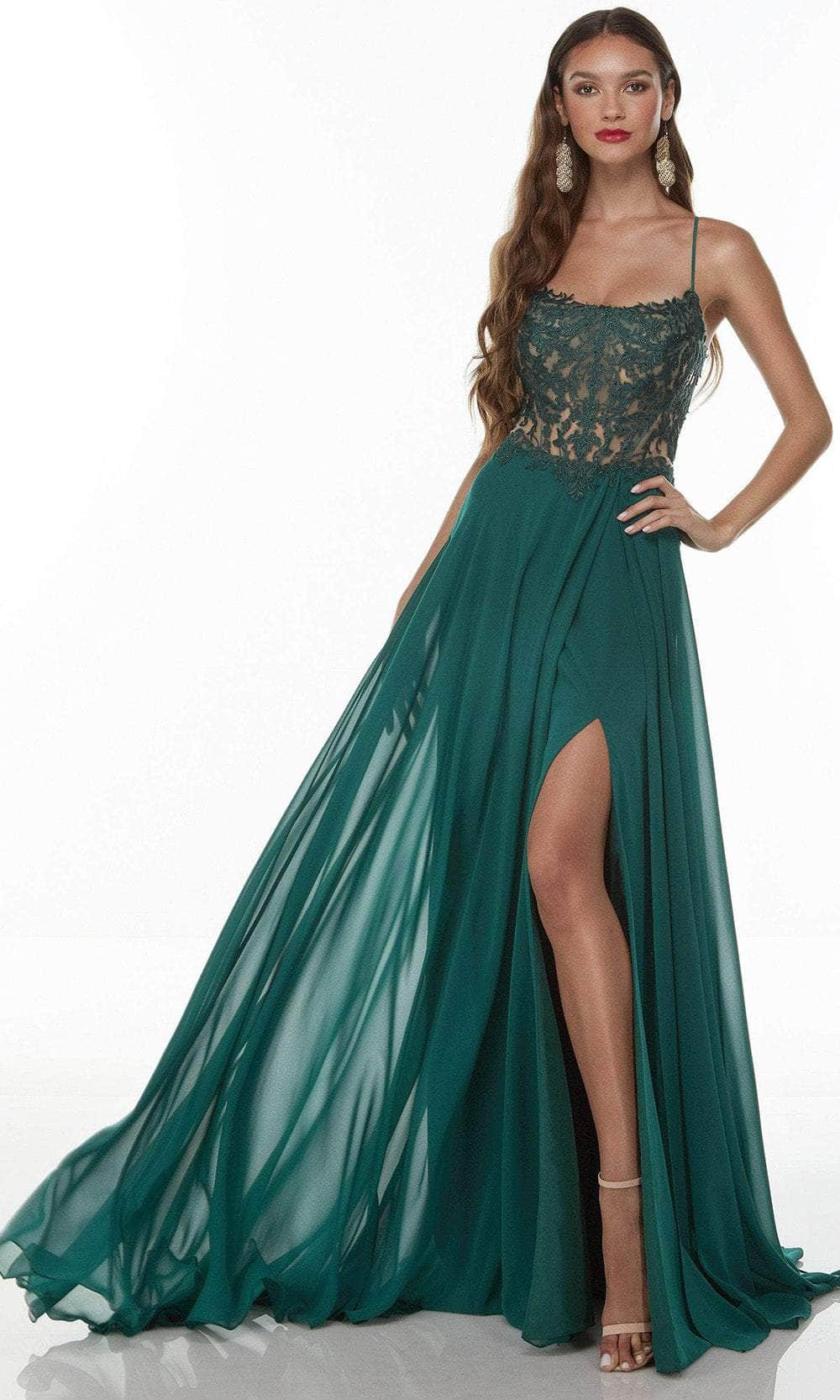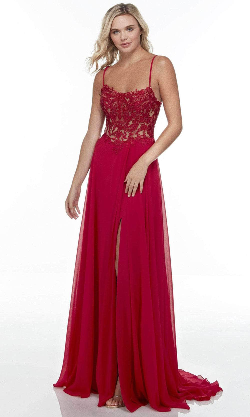 This enchanting Alyce Paris 61198 long gown is sure to make you the center of everyones attention. It features a sheer corset boning bodice gorgeously adorned with lace appliques and a beaded accent giving you a more beautiful look. The sleeveless gown shows off a scoop neckline and spaghetti straps that lead into the open back, creating a corset lace-up tie design for easy adjustments. The flowy chiffon skirt opens a thigh-high slit and it parades a full length A-line silhouette with a dramatic sweeping train finish. This stunning Alyce Paris creation brings together all the essentials for a great look at prom or party! Models are wearing the Blue Iris, Pine and Red colors.