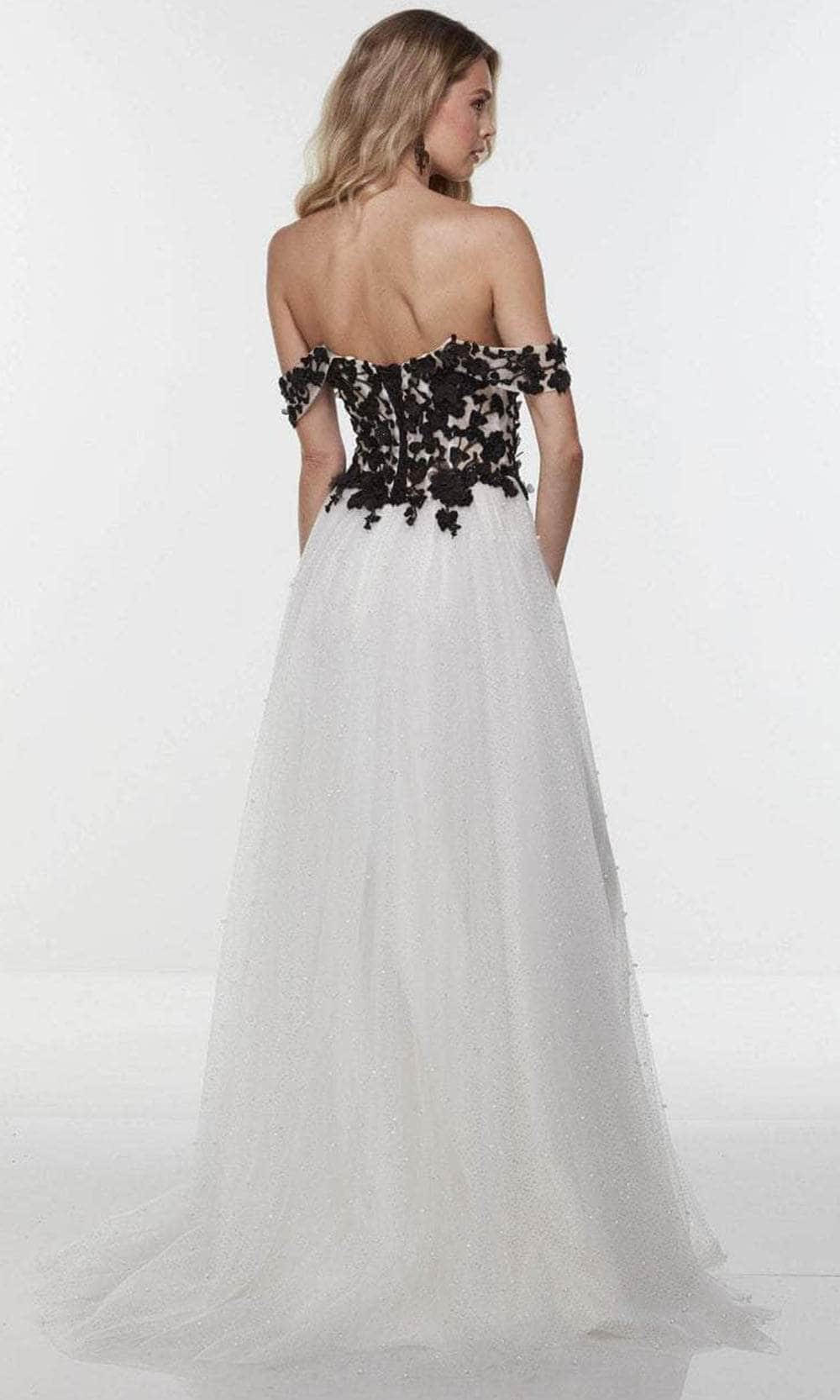 Get glamorous look with this evening dress by Alyce Paris 61219. This ensemble features 3D floral lace appliques over a corset boned fitted bodice. It showcases a sweetheart neckline with off-shoulder straps while the back offers a glimpse of skin with a zipper closure. A shimmering A-line silhouette cascades down from the natural waistline to a sweep of train complementing a high slit. Experience the outstanding effect in this sophisticated creation from the Alyce Paris collection. Model is wearing the Diamond White-Black color.