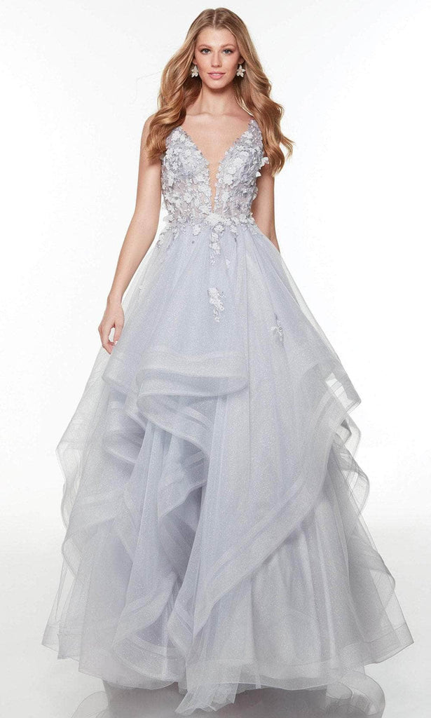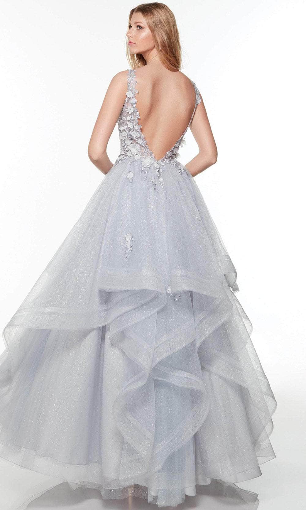 Channel the red carpet glamour wearing this by Alyce Paris 61235 masterpiece. This lovely dress is exquisitely embellished with lace embroidery and floral appliques, and it has a deep-cut neckline to complement the sheer bodice that is supported with boning and a cushioned bust for your comfort. The rear features an open design so that you can show off your sexy back. The skirt fashions a full-length semi-ballgown silhouette and is fun with its frilled structure in layers of glittered tulle. Mesmerize the crowd with your sophisticated flair in this Alyce Paris evening dress. Model is wearing Silver Lake color.