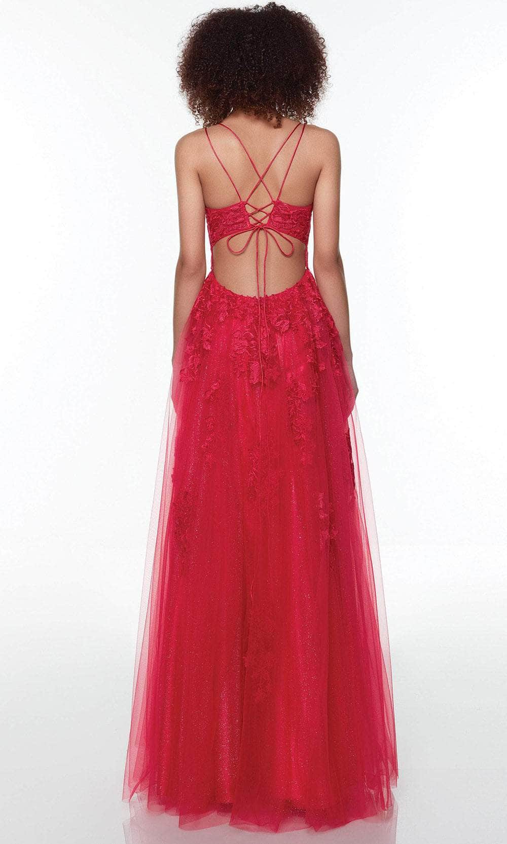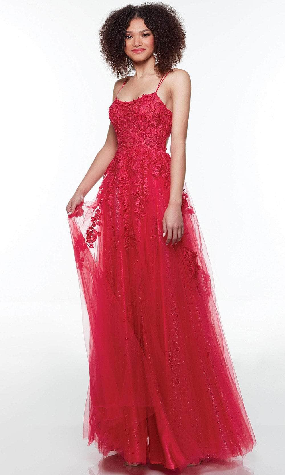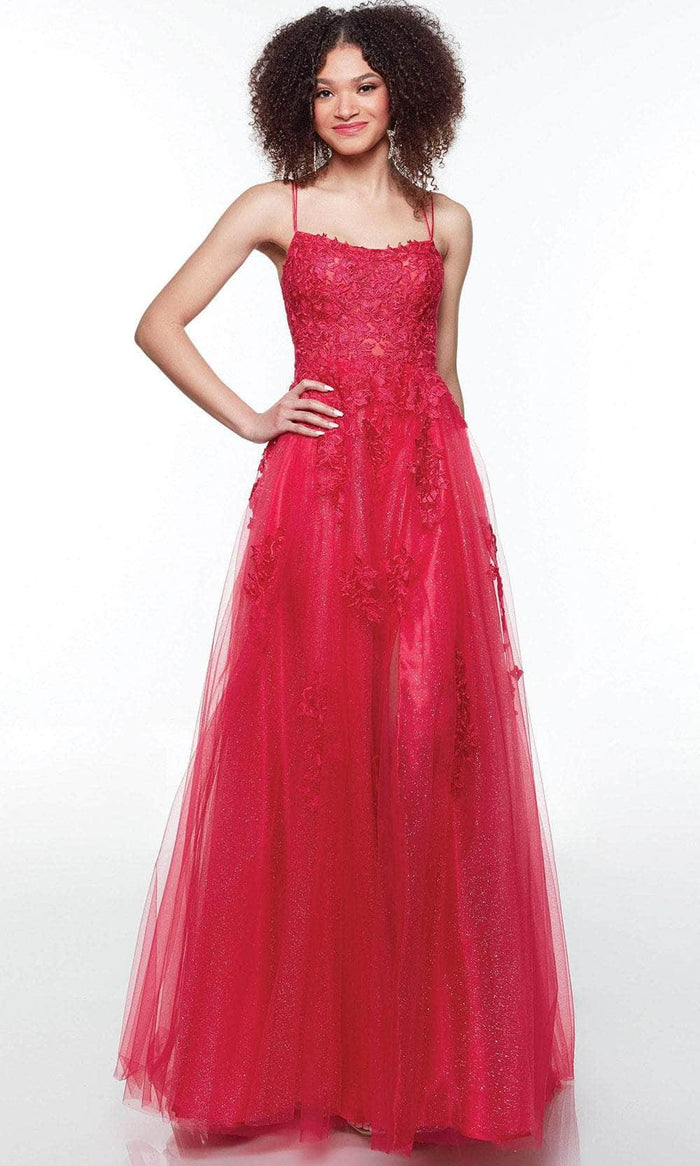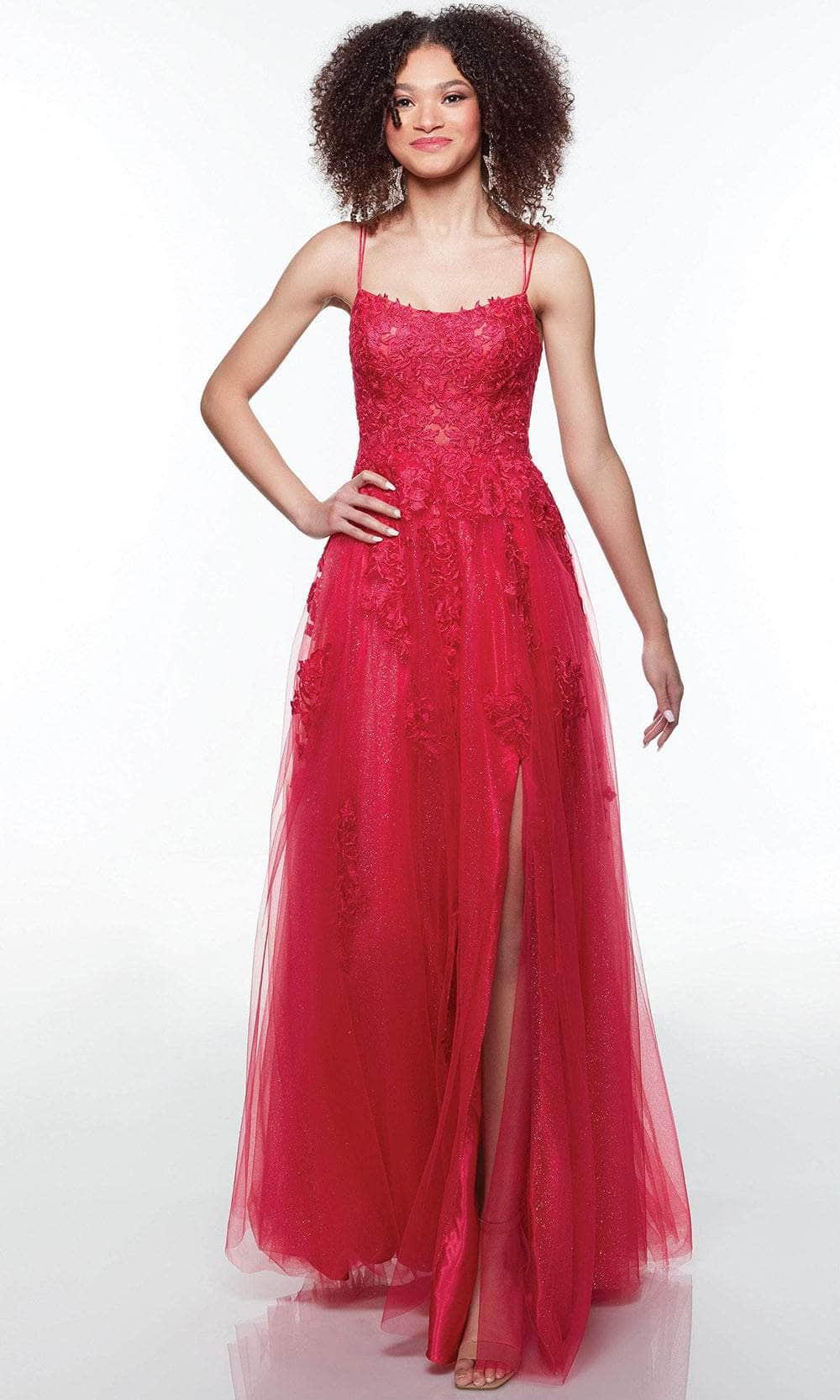 Show off your classy style when you wear this Alyce Paris 61255 long dress. This stylish ensemble showcases a scoop neckline on a sleeveless bodice and a sexy back, giving you an open style with a lace-up closure. exquisitely tailored on a delicate lace fabric with floral appliques, supported by glittered tulle, which will leave you sparkling all night long. The skirt glams in an A-line silhouette, which highlights your natural waistline as it gradually flares on the floor with a high slit. This Alyce Paris style will definitely make you feel special. Model is wearing Cerise color.