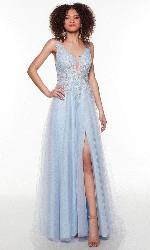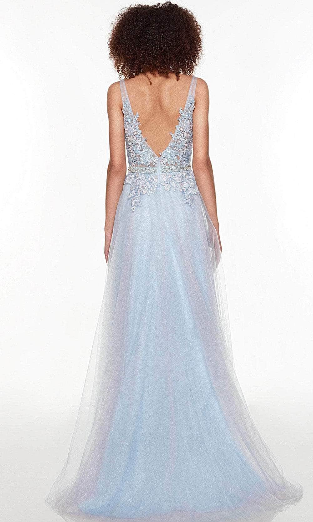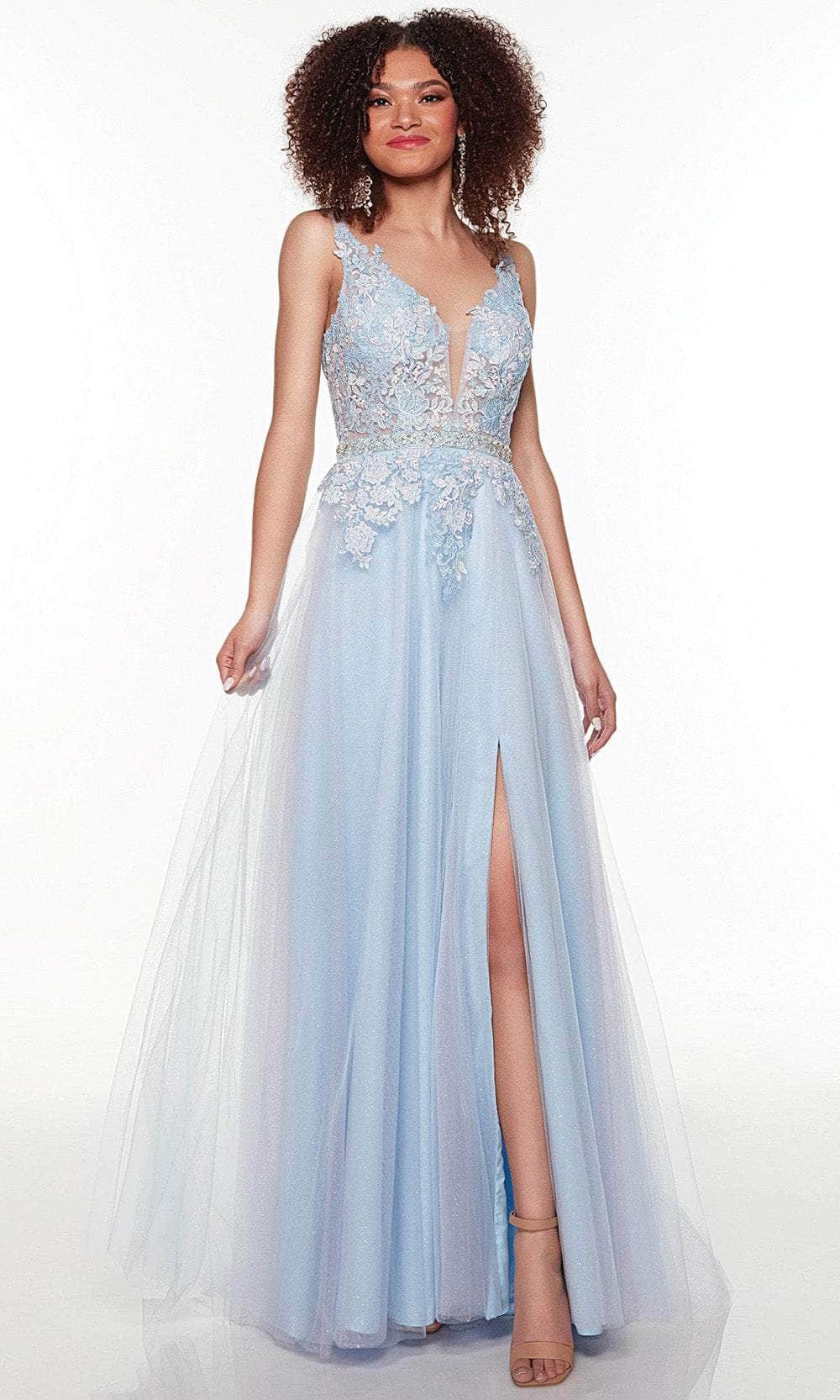 Make your grand entrance in this gorgeous long dress by Alyce Paris 61280. Dazzling floral lace appliques adorn the fitted bodice as the dress is framed with a flattering plunging V-neckline with illusion inset. An inch-wide shoulder straps lend support to the top as it leads to the open V-shaped back secured with a center zipper closure. The skirt parades an A-line silhouette which cascades to a full-length hemline with a sweep train finish. Get ready to shine in this fabulous creation from Alyce Paris masterpiece. Model is wearing the Glacier Blue color.