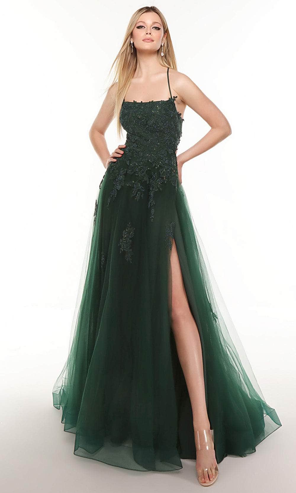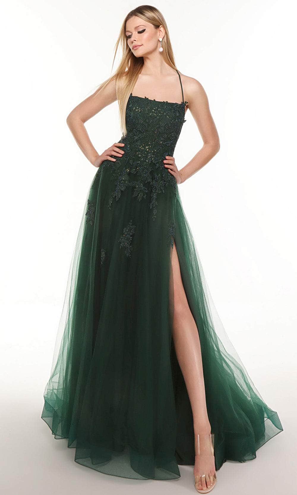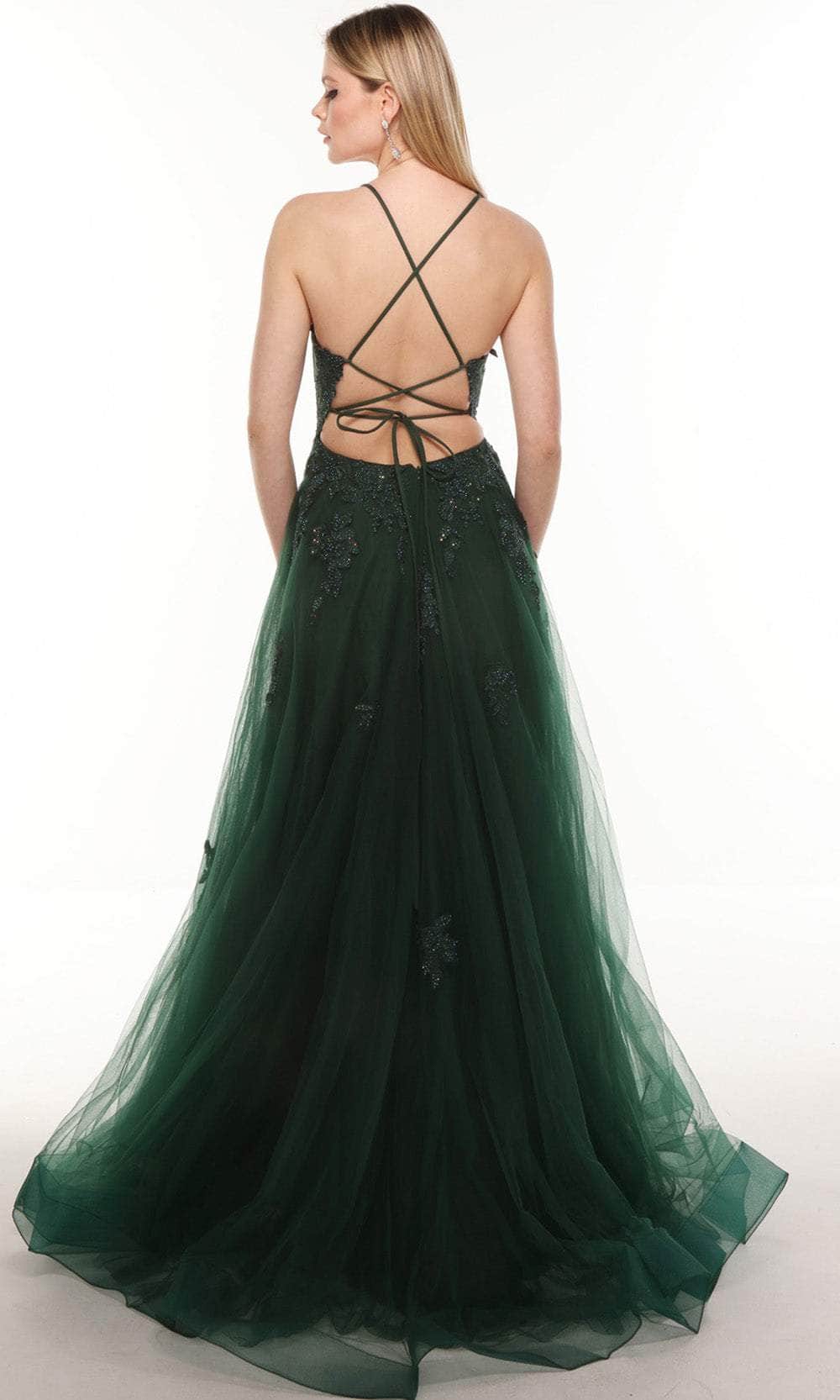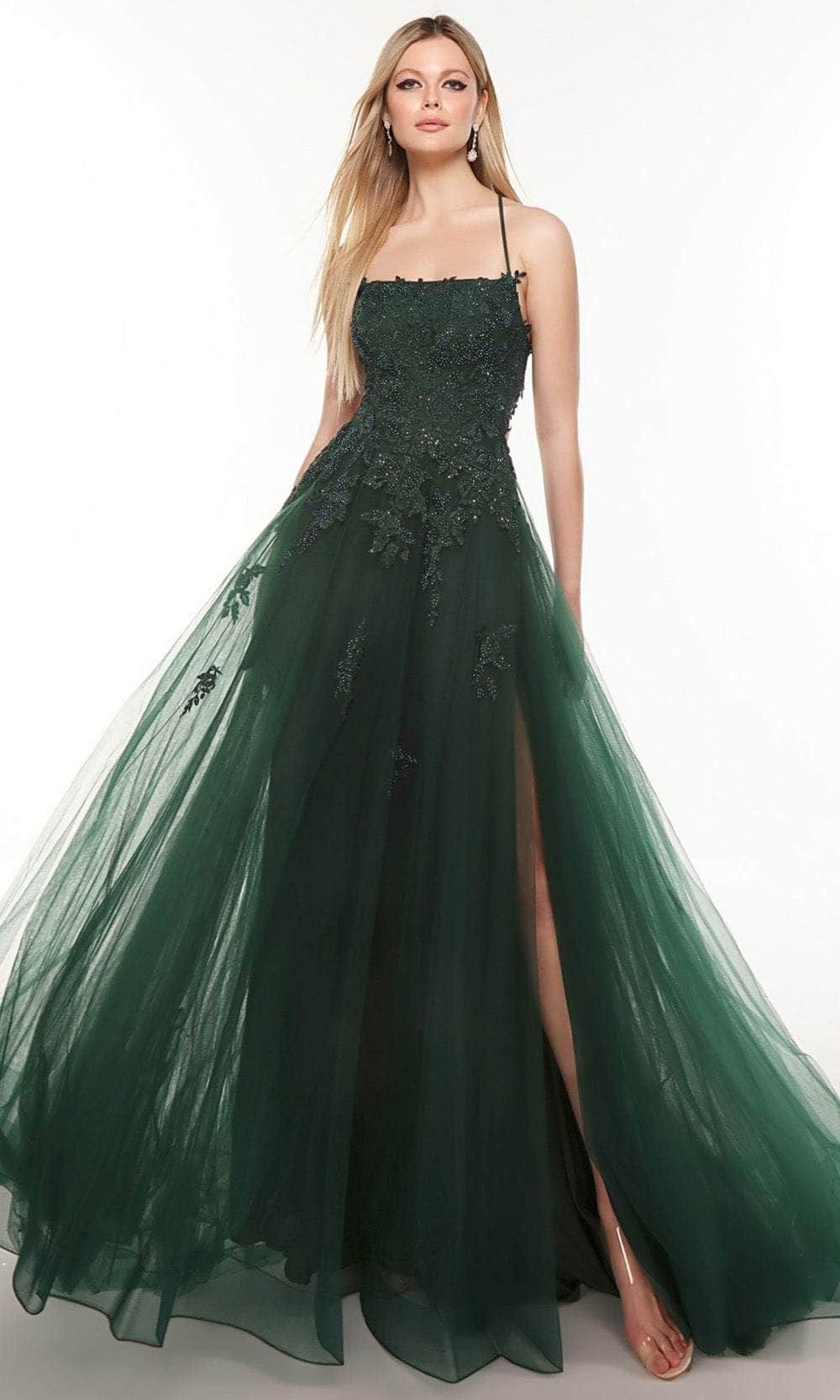 Channel your inner ballerina with this styling Prom Dress from Alyce Paris 61286. Whatever the dress code or dress style, we've got you prepared for Prom Night with this semi ballgown. Features a straight neckline with thin straps that cross at the back revealing an open sexy style. Floral and leaf motif adorns the bodice as it offer a little shimmer with its beads and stones. The skirt dazzles in layers of tulle as it shows your sexy legs with its high slit and leave you a train finish. Dance the night away with this Alyce Paris creation. Model is wearing the Pine color.