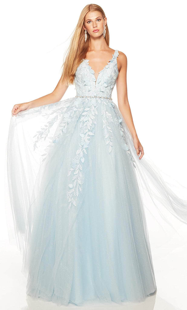 Put on this gorgeous beauty from Alyce Paris 61296 and draw admiring looks. This stunner, which is covered in the best embroideries, features a low-cut V-shaped open back and a sleeveless bodice with a plunging V neckline accented with a sheer inset. A jewel faux belt cinched the gorgeous bodice. The full-length glittering tulle skirt of the dress parades in an A-line silhouette. Channel your inner goddess in this tantalizing evening gown by Alyce Paris 61296. Model is wearing Light Blue color.