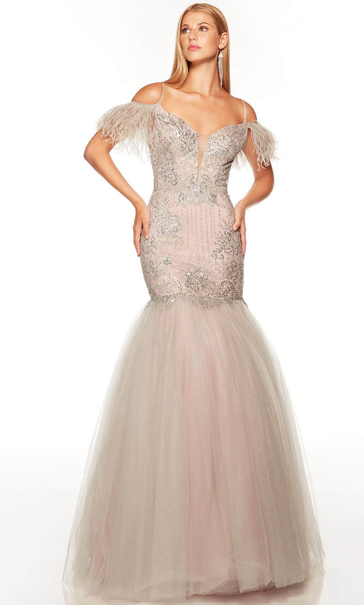 This luxurious evening gown from Alyce Paris 61409 will enhance your visual appeal. This piece is embellished with glittering sequins, ideal for a figure-hugging silhouette, and features a cold shoulder design with feather accents. A plunging V-neckline accented with sheer inset perfectly matches the mid-open back with a center zipper closure. The mermaid skirt is tailored from the glittering tulle fabric. Enjoy this Alyce Paris 61409 masterpiece with beauty and flair. Model is wearing Silver Rosewater color.