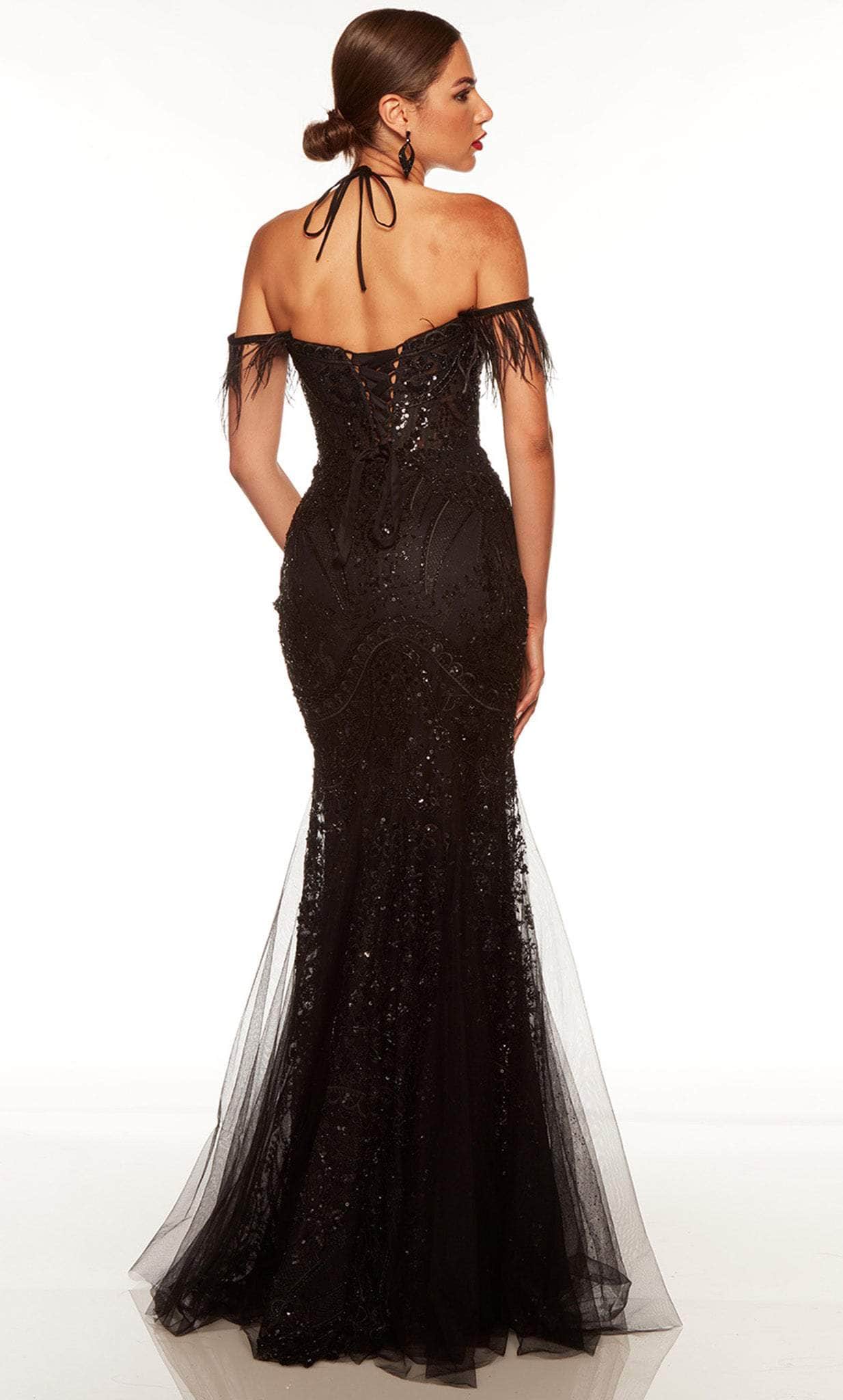 Walk the red carpet in style wearing this stunning Alyce Paris 61416 creation. The fitted gown is perfectly adorned with intricate sequins and beaded lace. It has a sheer corset bodice with a scoop neckline, halter-tie straps, and detachable off-shoulder feather sleeves. Capturing a corset lace-up back for a snug fit, the full length skirt reveals godets accents to create a trumpet silhouette and finishes in a sweeping train. Orchestrate your moment to stand out in this Alyce Paris 61416 masterpiece. Model is wearing the Black color.
