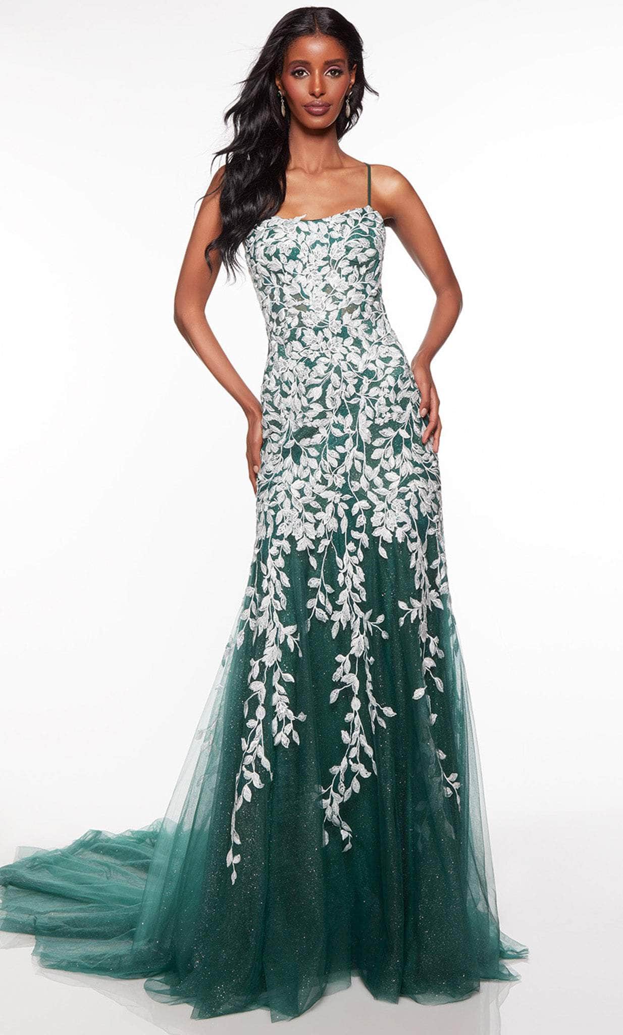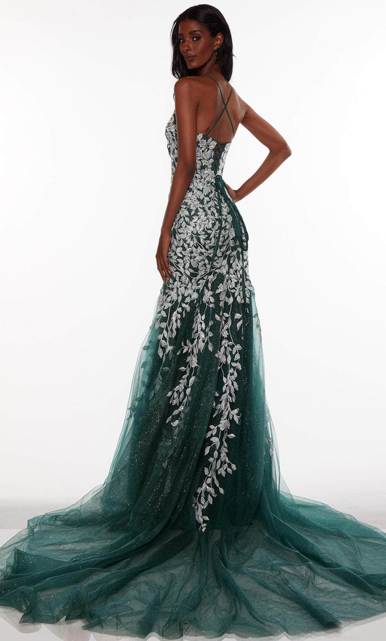 Make yourself into a vision of loveliness in this spectacular gown by Alyce Paris 61418. Featuring a classic sheer corset bodice, this mesmerizing glitter tulle style is sleeveless and richly adorns with foliage lace appliques. The spaghetti straps support the scoop neckline and crisscross on the corset lace-up back. Completing this look is a full length sheath silhouette with a court train for a dramatic flair. Orchestrate your moment to stand out in this Alyce Paris 61418 masterpiece. Model is wearing the Forest Green color.