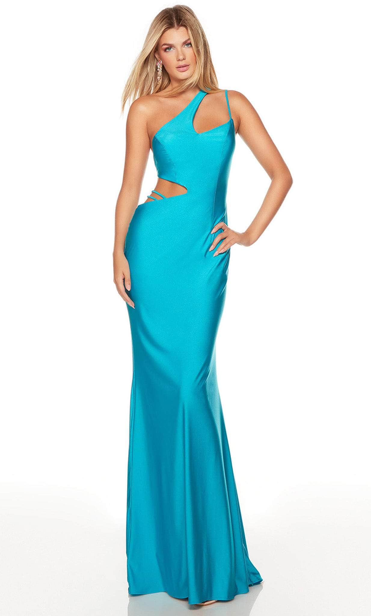 The Alyce Paris 61449 Prom Dress will make you sparkle on prom night. Made from dazzling sparkle knit jersey, this stunning dress is sure to garner plenty of attention. The dress has a fascinating design that stands out thanks to its one shoulder, asymmetrical neck, and openings at the neck, side, and back. The sheath cut and full length accentuate your curves, while the sweeping train add an aura of elegance. This Alyce Paris 61449 is a stunning evening gown that will turn heads at your prom. Model is wearing the Lagoon color.