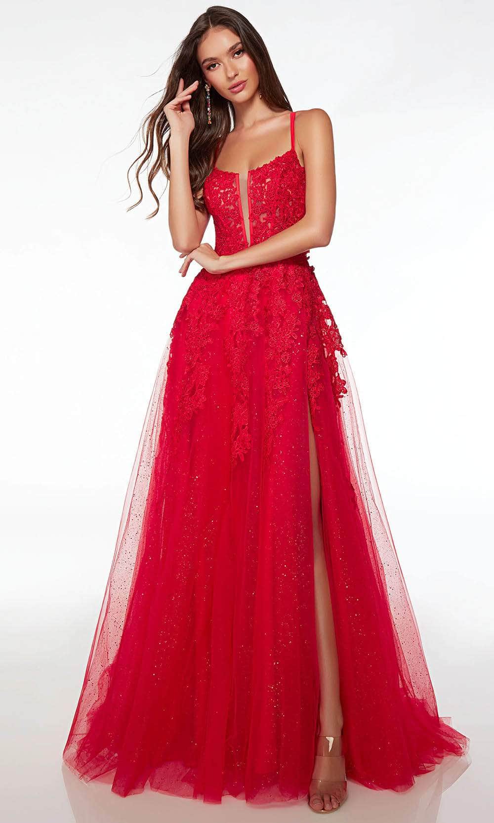 Wrap up in this winning style for the night in this Alyce Paris 61477 masterpiece. Blooming lace appliques and glitters give this sleeveless ensemble a lovely appearance that is sure to captivate. The plunging v-neckline is displayed, accompanied by dual spaghetti straps that intersect at the open back to form a strappy design. With a convenient pocket and thigh-high leg slit, the tulle skirt creates an elegant A-line silhouette that pools into a dramatic sweeping train. When you wear this Alyce Paris 61477 gown, you will turn heads right away. Models are wearing Everglade, and Lipstick colors.