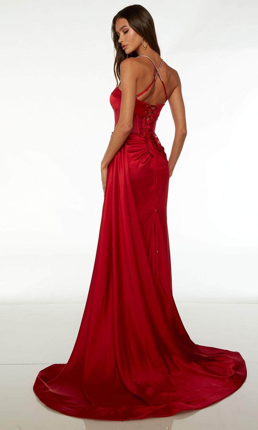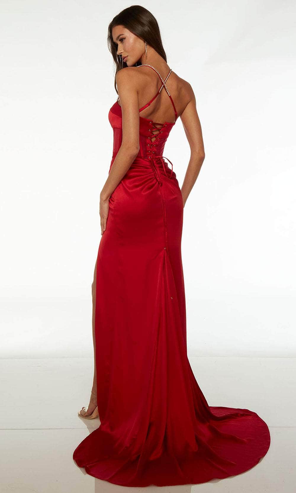 Stand out in the crowd and become the object of admiration with this Alyce Paris 61486 gown. Tailored to accentuate your timeless beauty and opulence, this dress is embellished with an illusion inset atop a corset boned plunge. The upper bodice showcases a straight-across neckline adorned with embellished straps. Featuring crisscross straps at the back with a lace-up closure, this gown forms a sleek sheath silhouette that gracefully descends to the floor, culminating in a sweeping train. The thigh-high slit at the front adds a touch of seductive allure, while a detachable sash introduces a dramatic element to this ensemble. Make a statement in this radiant Alyce Paris 61486 creation. Models are wearing the Red and Midnight colors.