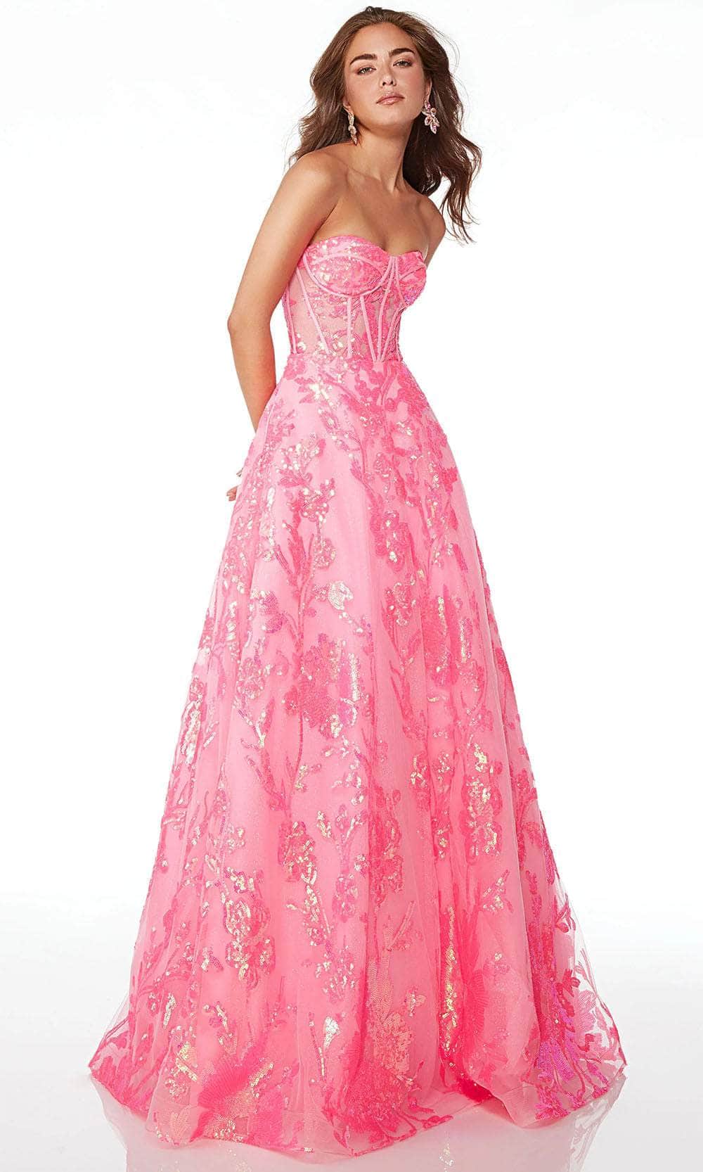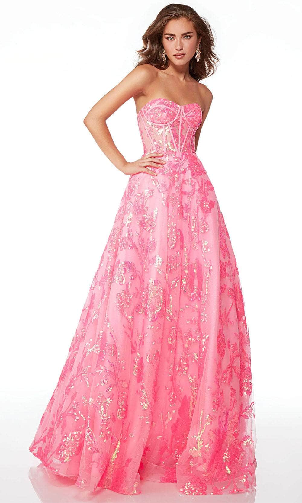 Look stunning in this vogue Alyce Paris 61682, featuring a strapless bodice adorned with sequin embellishments and delicate embroidery for a touch of glamour. The open back and corset bodice add allure, while the long ballgown silhouette skirt flows elegantly. Completed with a lace-up back and back zipper closure, this gown ensures a perfect fit for formal events. Alyce Paris 61682 combines timeless elegance with modern charm, promising a memorable and stylish appearance with its intricate design elements. Model is wearing Neon Pink color.