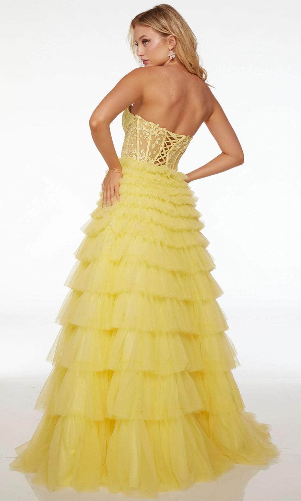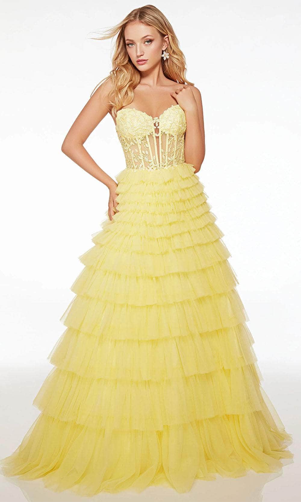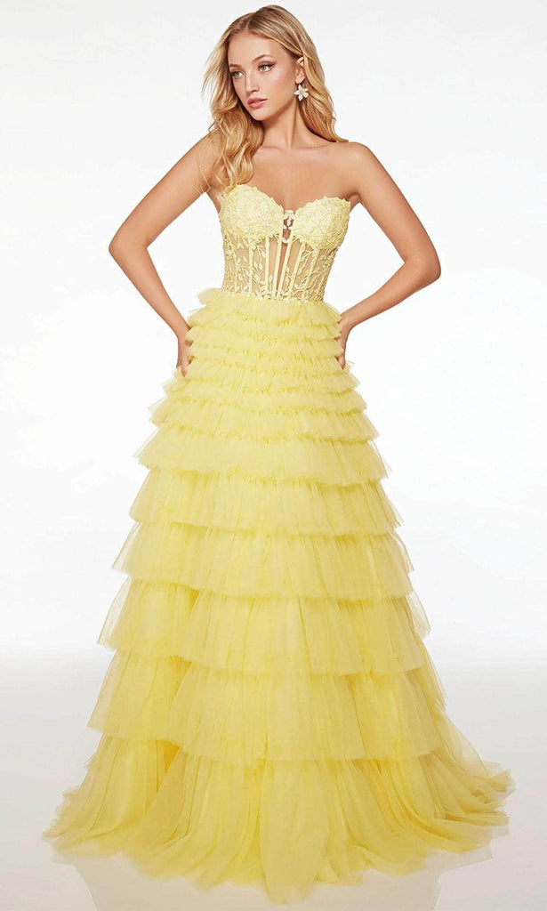 Promote attention-grabbing style in this stunning Alyce Paris 61553 evening dress. Prepare yourself to be admired when you wear this dress which features an endearing strapless plunging sweetheart neckline on a fitted, illusion bodice. It also reveals a sophisticated mid-open back that is enclosed by lace for a graceful finish. Additionally, the top is adorned with boning as well as embroidery designs, while the fabulous A-line skirt showcases majestic ruffles, elevating the overall appeal of this attire. Take their breath away with this stunning Alyce Paris 61553 masterpiece. Model is wearing Light Yellow color.
