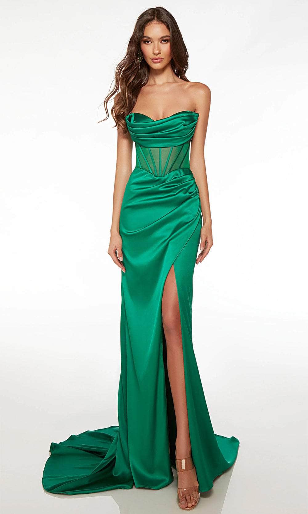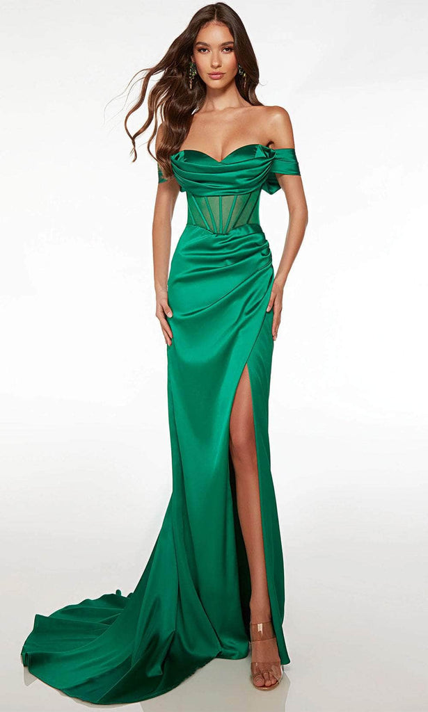 Capture the glamour as you walk on this stunning gorgeous Alyce Paris 61572 evening dress. You will surely look utterly fetching once you wear this dress which features an endearing sweetheart neckline on a fitted and sleeveless bodice, complemented by detachable off-shoulder sleeves. It also reveals an illusion top with boning details, while the sheath skirt highlights a slit as well as a majestic court train. Its back is mid-open and is enclosed by a zipper for a refined finish. Draping effects are also visible on the chest and hips, elevating the overall appeal of this satin attire. Mesmerize the crowd with your sophisticated flair in this Alyce Paris 61572 masterpiece. Models are wearing Emerald, and Emerald-Sand colors.