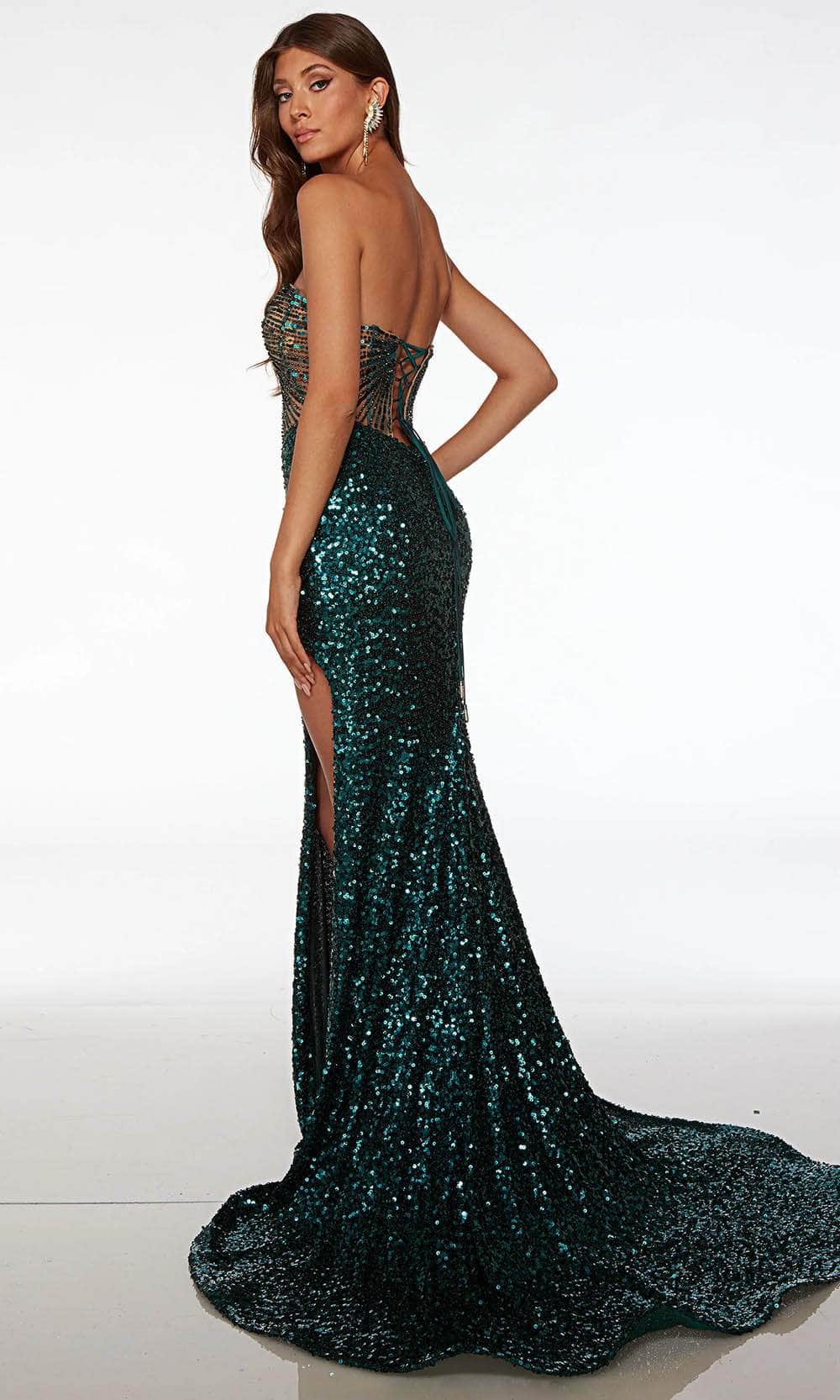 You will be the envy of the night in this amazing gown by Alyce Paris 61573. Sculpted to showcase your timeless beauty and luxury, this strapless gown is fully adorned with sequins and beaded. The top bodice highlights the illusion corset design, sweetheart neckline, and a low open back with lace-up closure. From the basque waist, the skirt makes a sheath silhouette that gracefully descends to the floor and sweeping train. The thigh-high slit at the front gives a hint of seductive appeal. Get noticed in this radiant Alyce Paris 61573 creation. Model is wearing Everglade color.