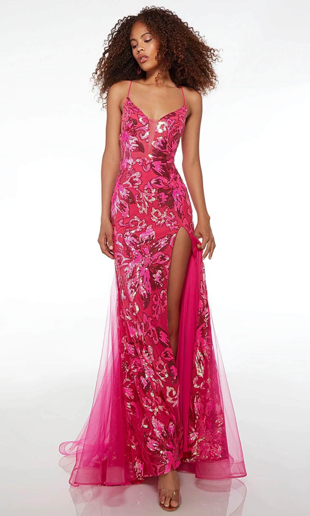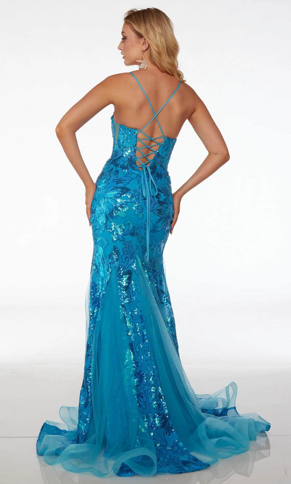 Look fabulous for your event in this Alyce Paris 61617 masterpiece. Embellished with a lavish display of floral sequins, this sleeveless gown catches the eye with its shimmering beauty. The plunging v-neckline with sheer inset detailing at the bust adds a touch of allure, while the corset lace-up back allows you to adjust the fit. The front thigh-high slit and the tulle godets with horsehair trim bring a dramatic effect. The skirt gracefully pools into a sweeping train, creating the appearance of a mermaid silhouette. Be dressed up beautifully in Alyce Paris 61617 gown. Models are wearing Cerulean Blue, Fuchsia, and Teal colors.