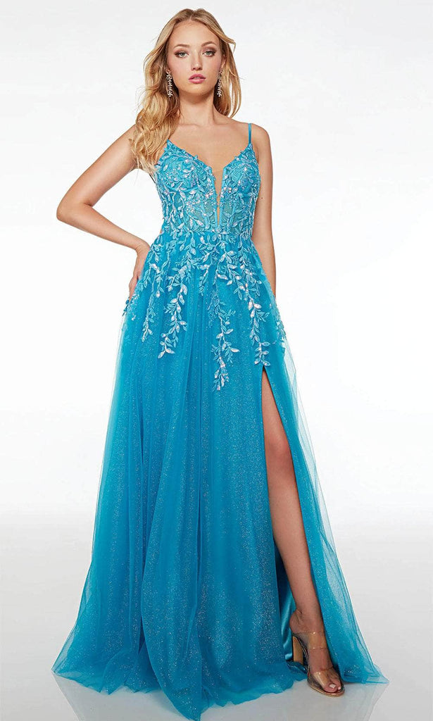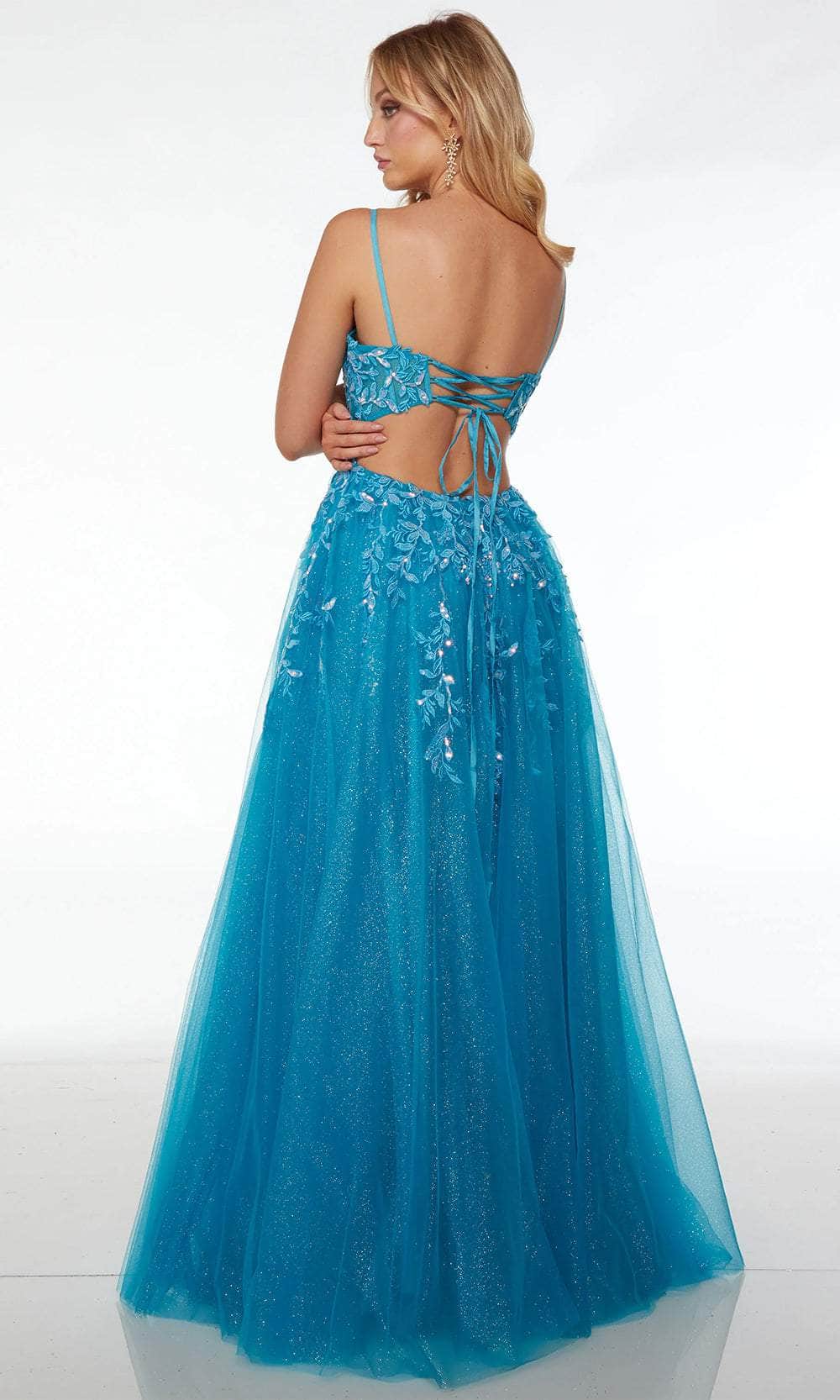 Waltz into the party looking fabulous in this Alyce Paris 61623 dress, that features a spaghetti strap corset bodice with a sheer insert, exuding elegance. An open back adorned with sequins and embroidery adds a touch of glamour, while a side slit enhances the design. The long-length skirt flows beautifully in an A-line silhouette, completed with a back lace-up tie for a perfect fit. Ideal for formal events, Alyce Paris 61623 combines sophistication and allure, ensuring a memorable and stylish appearance. Model is wearing Cyan color.