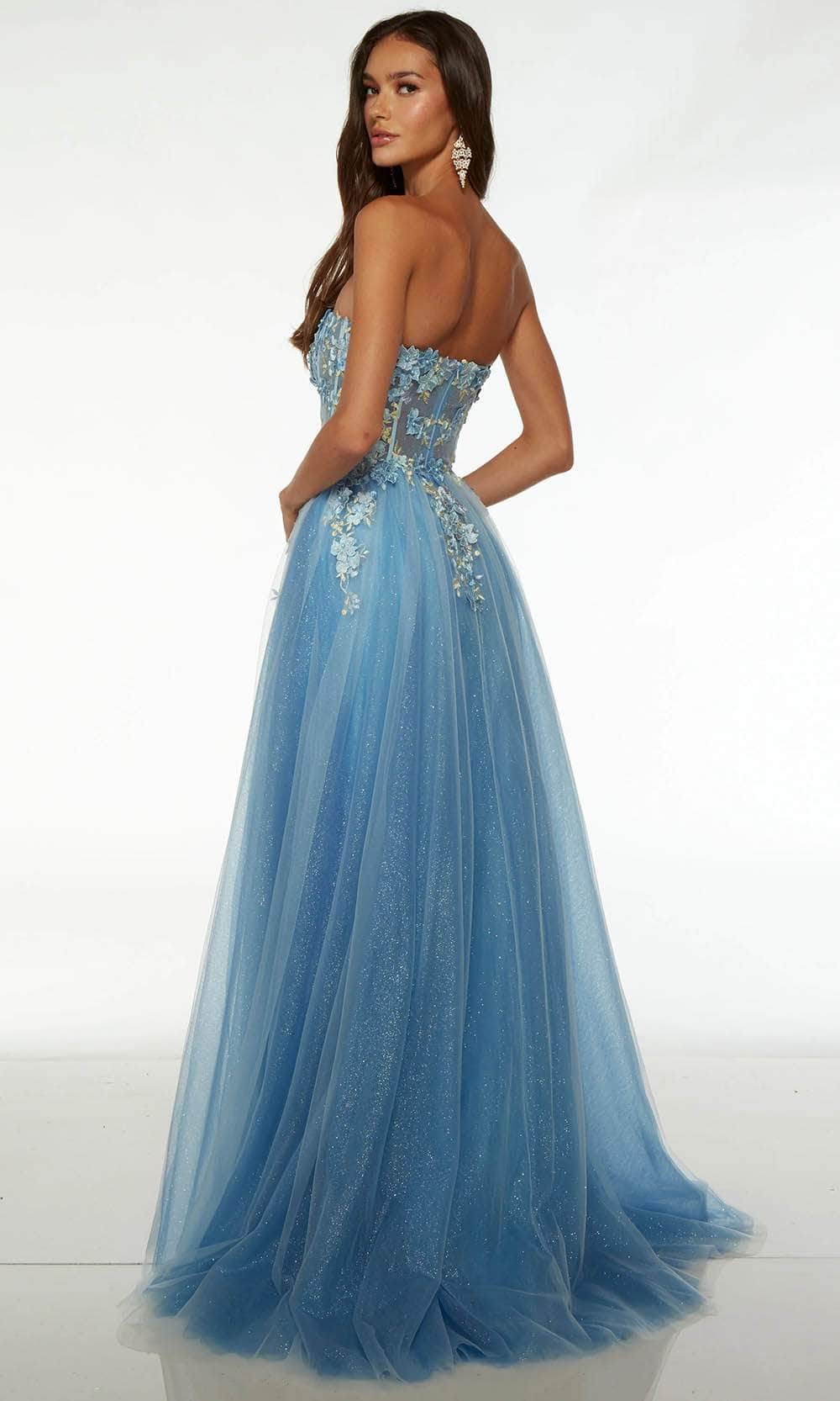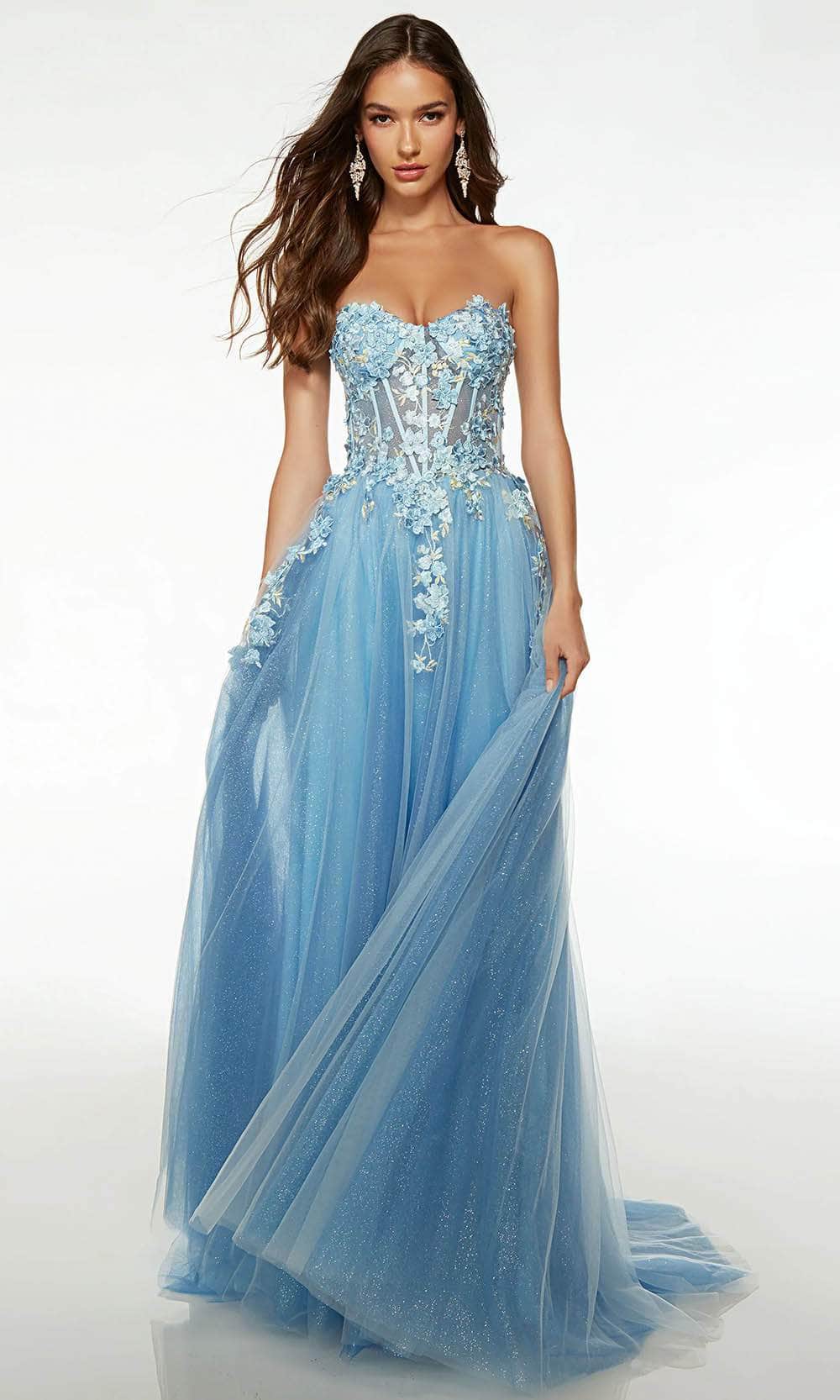 Bloom with loveliness in this Alyce Paris 61634 masterpiece. Crafted from luxurious glitter tulle, this strapless ensemble is meticulously ornamented with 3D floral applique and embroidery. The illusion corset top has a boning detail, sweetheart neckline, and classic straight mid-open back. The shirred skirt alluringly forms an A-line silhouette that flows to the full-length hem and finishes with a dramatic sweeping train. This enchanting Alyce Paris 61634 gown is sure to make you the center of everyones attention. Model is wearing Periwinkle color.