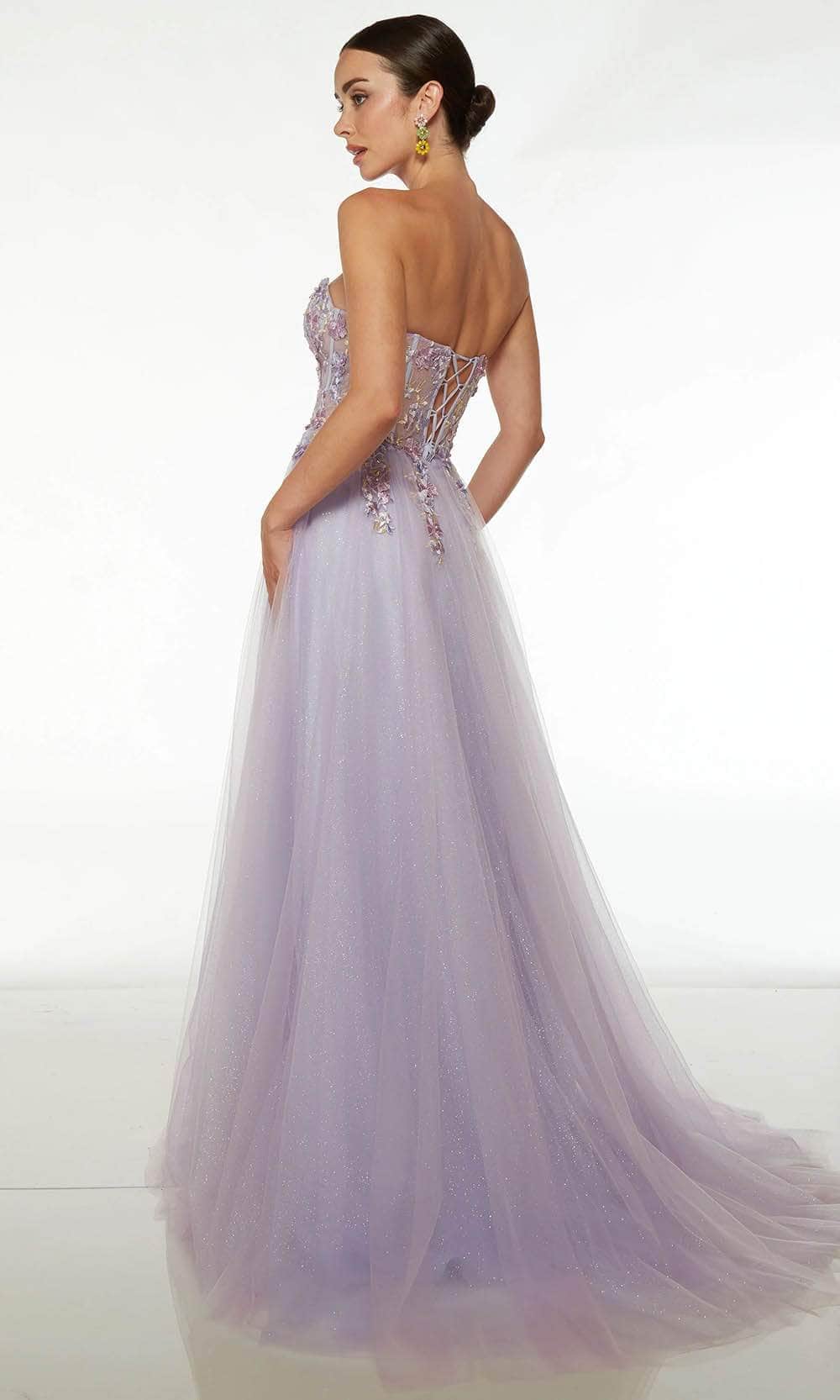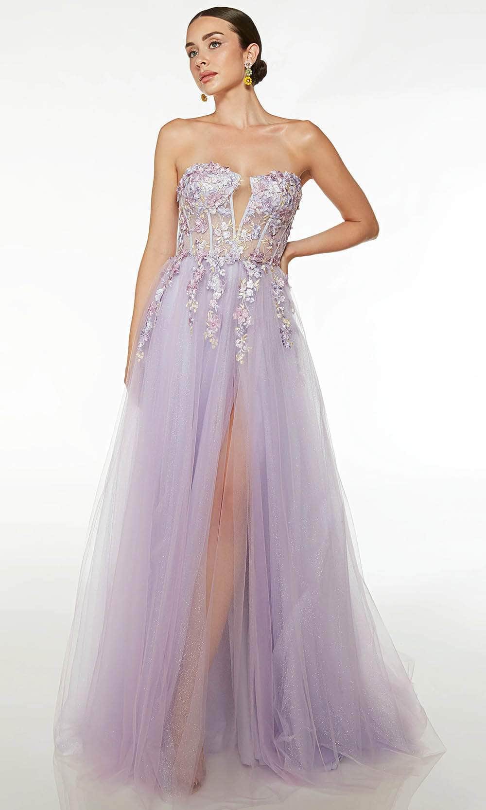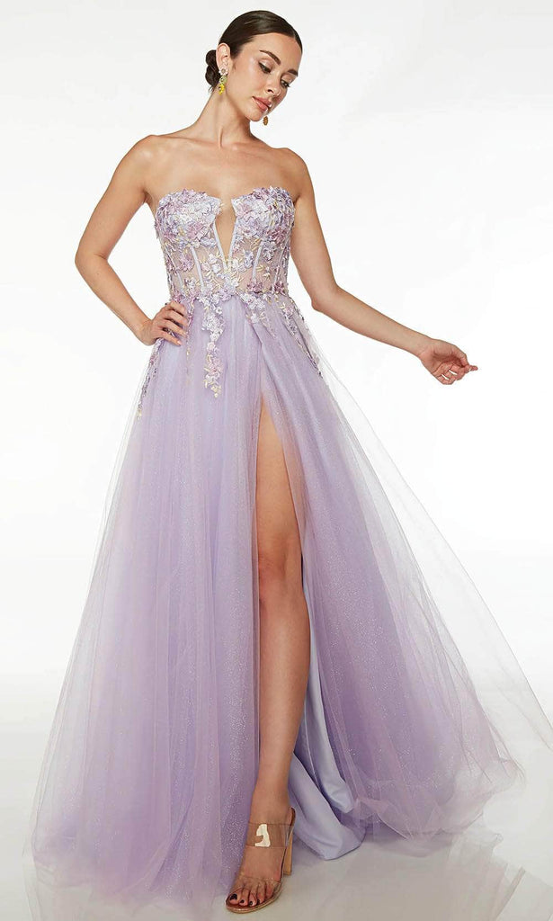 Indulge in enchantment with Alyce Paris 61654—a mesmerizing gown crafted from ethereal Lace-tulle. The Corset bodice, a masterpiece of Floral Lace and delicate Appliques, embraces a sweetheart neckline that exudes romance. The back is a canvas of allure with a Lace-up design. The A-line silhouette of the floor-length skirt features a daring front slit, adding a dash of allure to every step. Culminating in a graceful train, this Alyce Paris 61654 is a symphony of elegance and drama, promising a night of unforgettable allure. Model is wearing Lilac color.