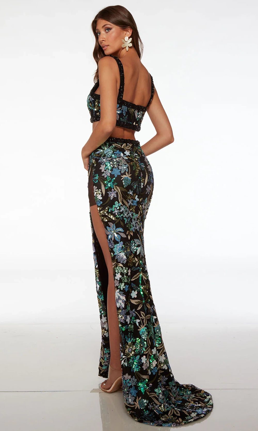 Fall in love with the Alyce Paris 61689 dress that fuses contemporary form with floral artistry in a vibrant two-piece silhouette. The crop top is styled with wide shoulder straps and a flattering V-neckline, while the coordinating sheath skirt adds drama and movement. Intricately embroidered floral sequins in contrasting shades create dimension and depth. A thigh-high leg slit offer a peek of skin without compromising sophistication. Alyce Paris 61689 is ideal for those seeking bold fashion with refined embellishment and a vibrant silhouette. Models are wearing Black-Orange, and Blue Green-Multi colors.