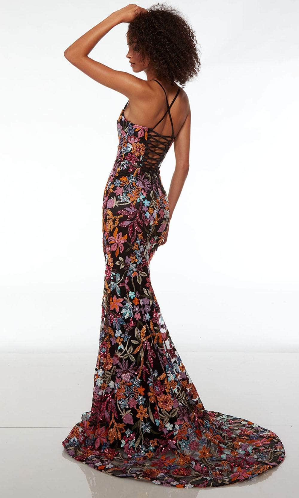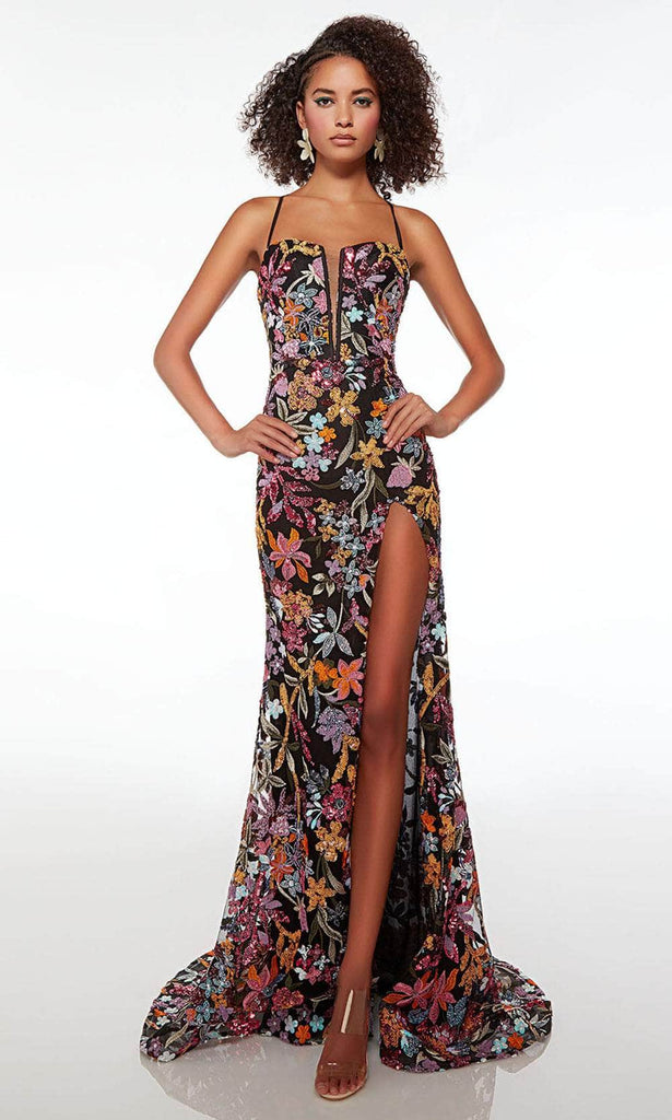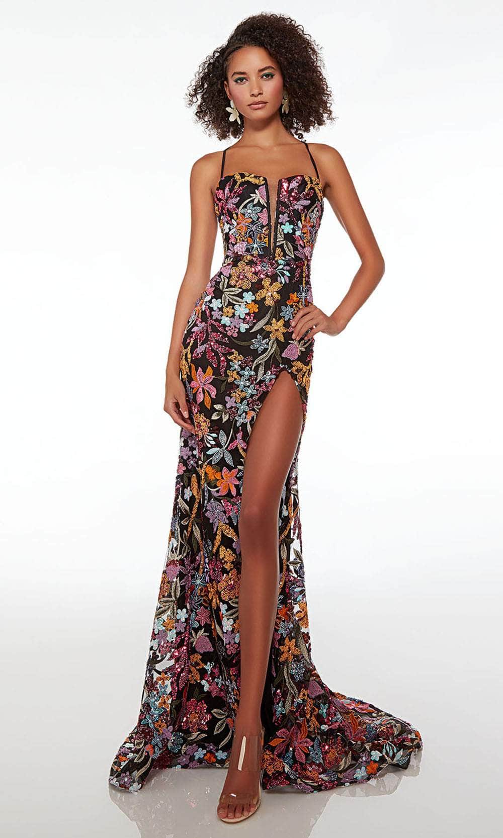 Turn heads on your special gathering with this Alyce Paris 61690 a mesmerizing gown adorned with intricate floral embroideries and sequins. The sleeveless fitted bodice boasts a plunging neckline and a captivating crisscross strap that elegantly ties at the open back with a secure zipper closure. The floor-length skirt parades in a sheath silhouette, accentuated by a tasteful slit, concluding with a graceful train. This enchanting Alyce Paris 61690 promises a night of refined allure, capturing attention with every step and ensuring unforgettable moments. Model is wearing Black/Orange color.