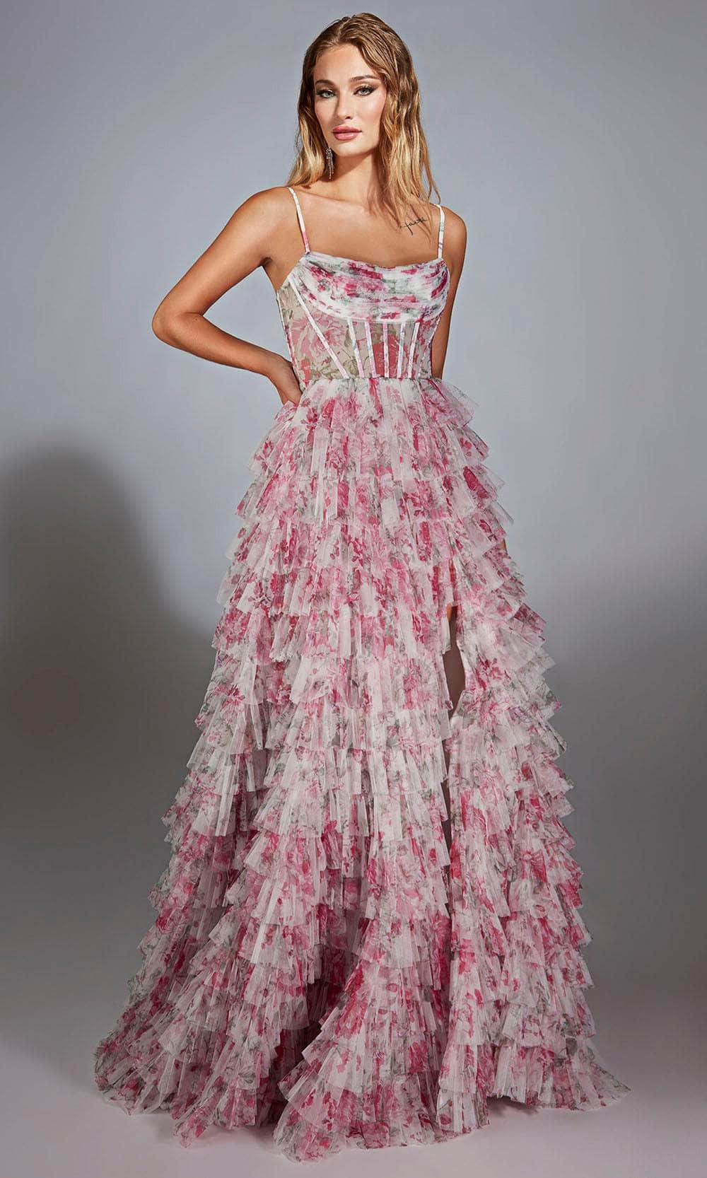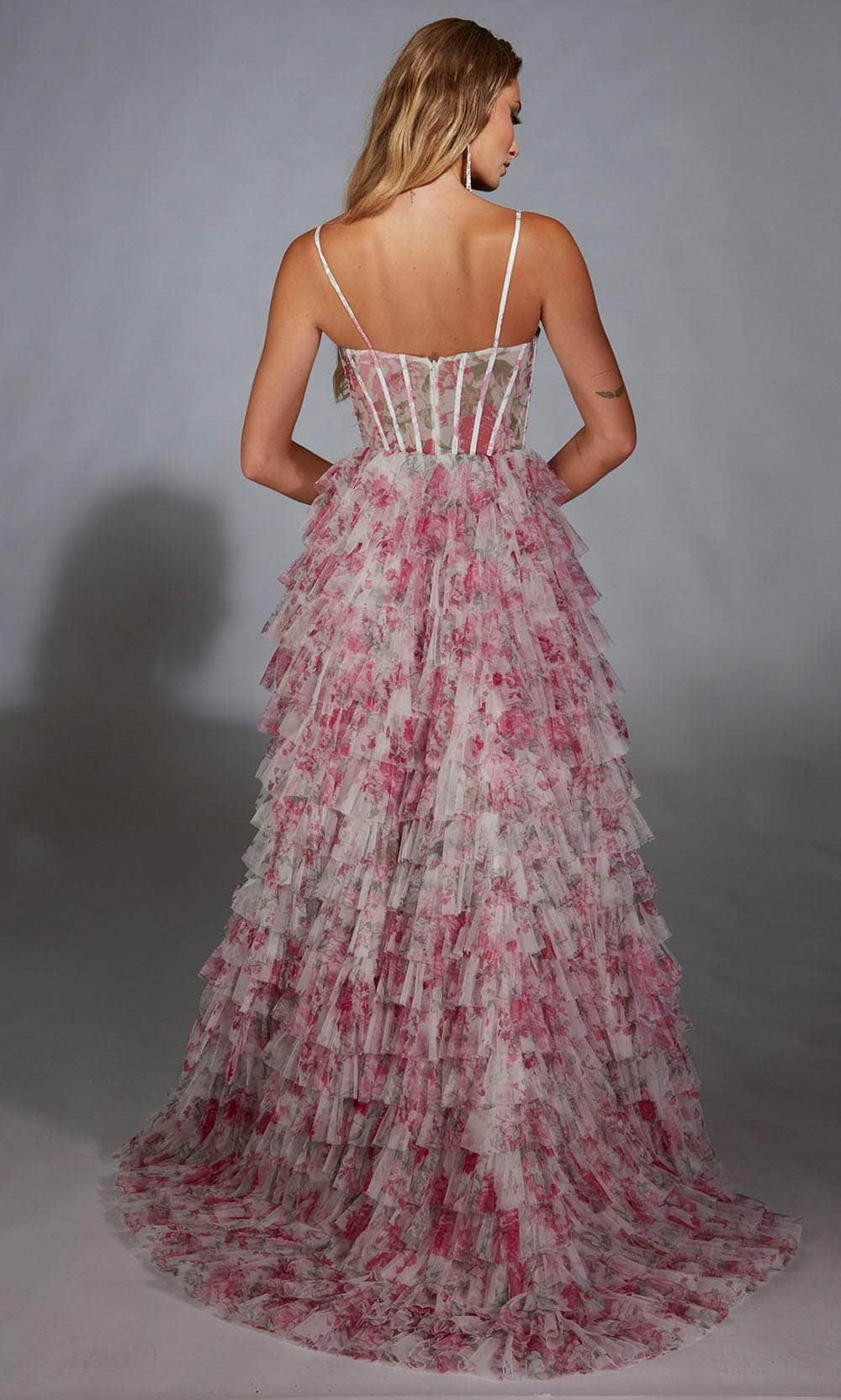 Step into sophistication with the Alyce Paris 61732, a graceful A-line gown that radiates charm and elegance. The floral-printed mesh fabric is complemented by a structured corset bodice, ensuring a flattering silhouette. Delicate spaghetti straps add a refined touch, while the tiered ruffles and high slit create a dynamic and flowing movement. Whether for prom, a gala, or any special occasion, this dress is designed to captivate. Elevate your evening look with the Alyce Paris 61732 and make a lasting impression at any event. Model is wearing Pink-White color.