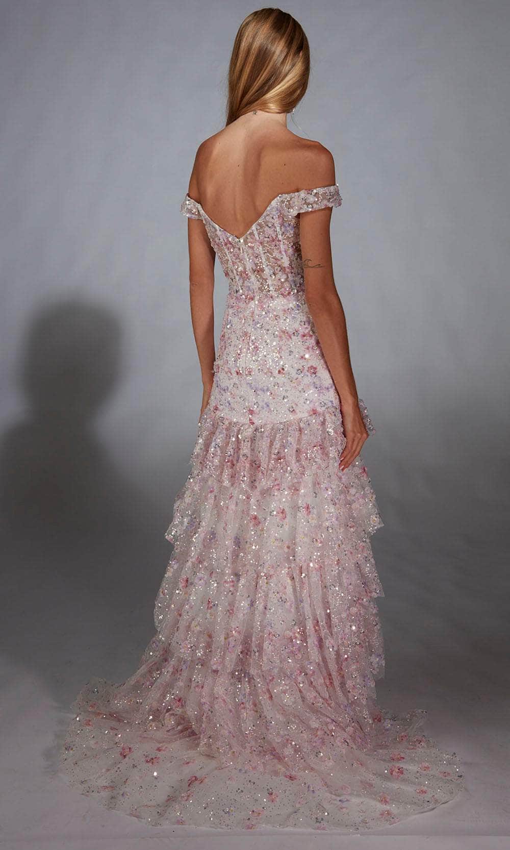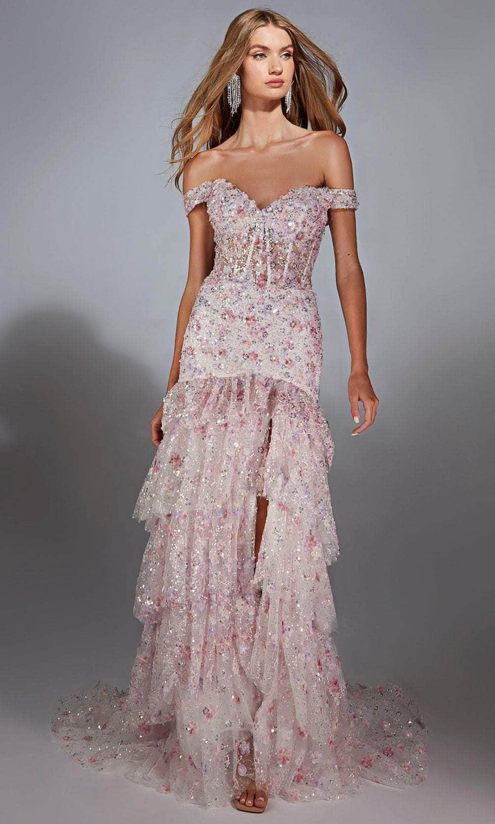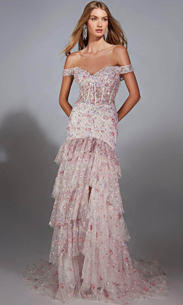 Indulge in romance and elegance with the Alyce Paris 61736. This off-the-shoulder gown features a sweetheart neckline and open back, while the beautifully floral sequin bodice creates a dreamy aesthetic. The fitted bodice gracefully transitions into cascading ruffles that add a touch of drama and sophistication. A perfect choice for prom or a formal event, this trumpet gown embodies charm and sophistication. Make your evening unforgettable with the Alyce Paris 61736 and captivate with every step. Model is wearing Pink color.