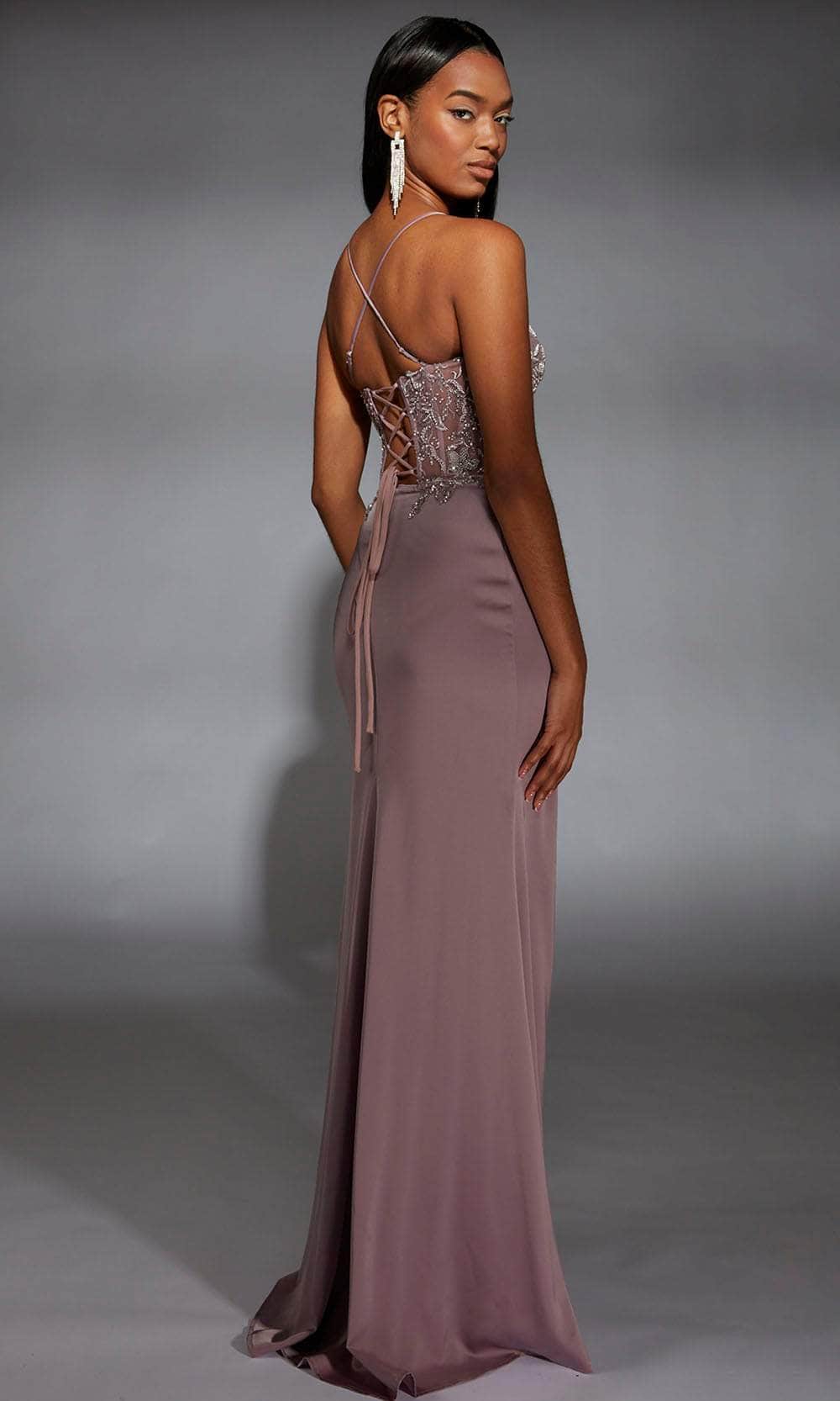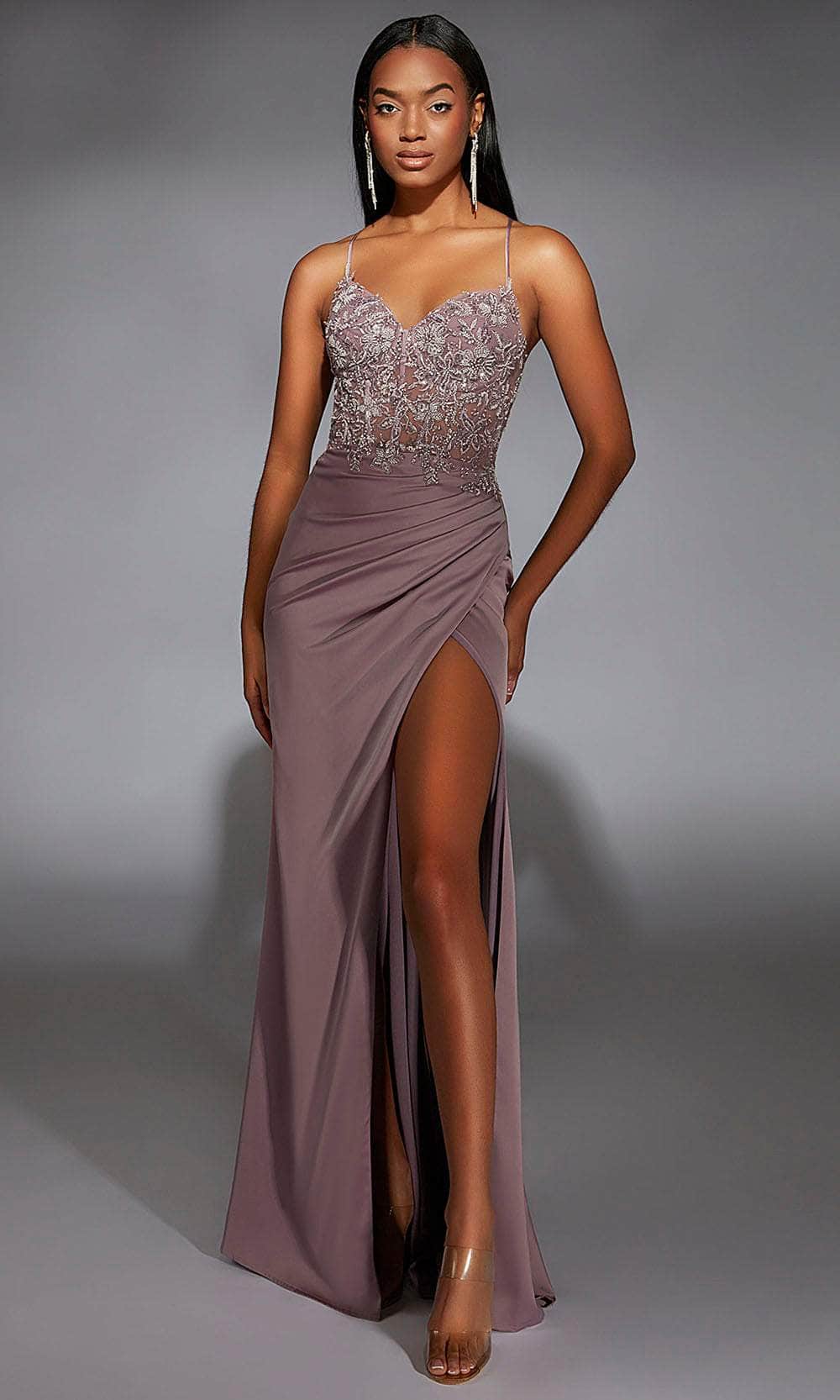 Radiate effortless charm in this sleek and timeless sheath gown from Alyce Paris 61741. The sleeveless ensemble is crafted from satin chiffon fabric, sculpting a silhouette that is both refined and striking. The spaghetti straps complement the sweetheart neckline, creating an elongated and graceful appearance. A thigh-high slit adds allure, while the open back has crisscross and lace-up design that keeps the look modern and captivating. Whether you are attending a formal event, an upscale gala, or a sophisticated evening affair, this Alyce Paris 61741 ensures you exude confidence and elegance with every step. Model is wearing Heather color.