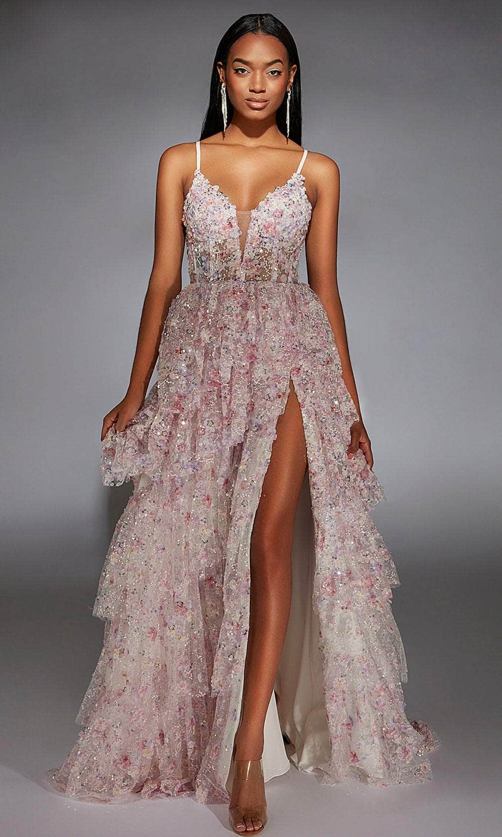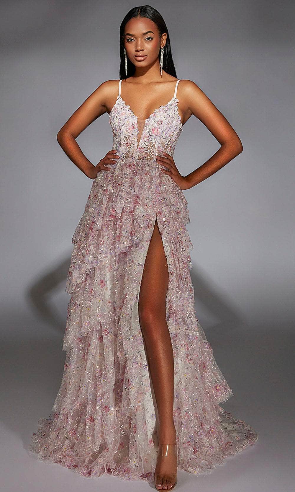 Radiate charm and sophistication in the Alyce Paris 61745 floral applique gown. Featuring a plunging V-neckline and captivating floral sequin embellishments, this sleeveless gown exudes romance and elegance. The flowing A-line silhouette and high slit offer movement and allure, making it ideal for proms, or evening soirees. Designed for those who appreciate timeless beauty, the Alyce Paris 61745 long gown is the perfect choice for a dreamy and unforgettable look. Model is wearing Pink color.