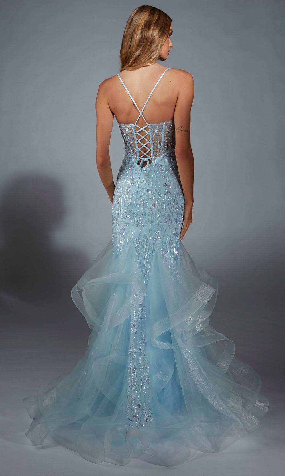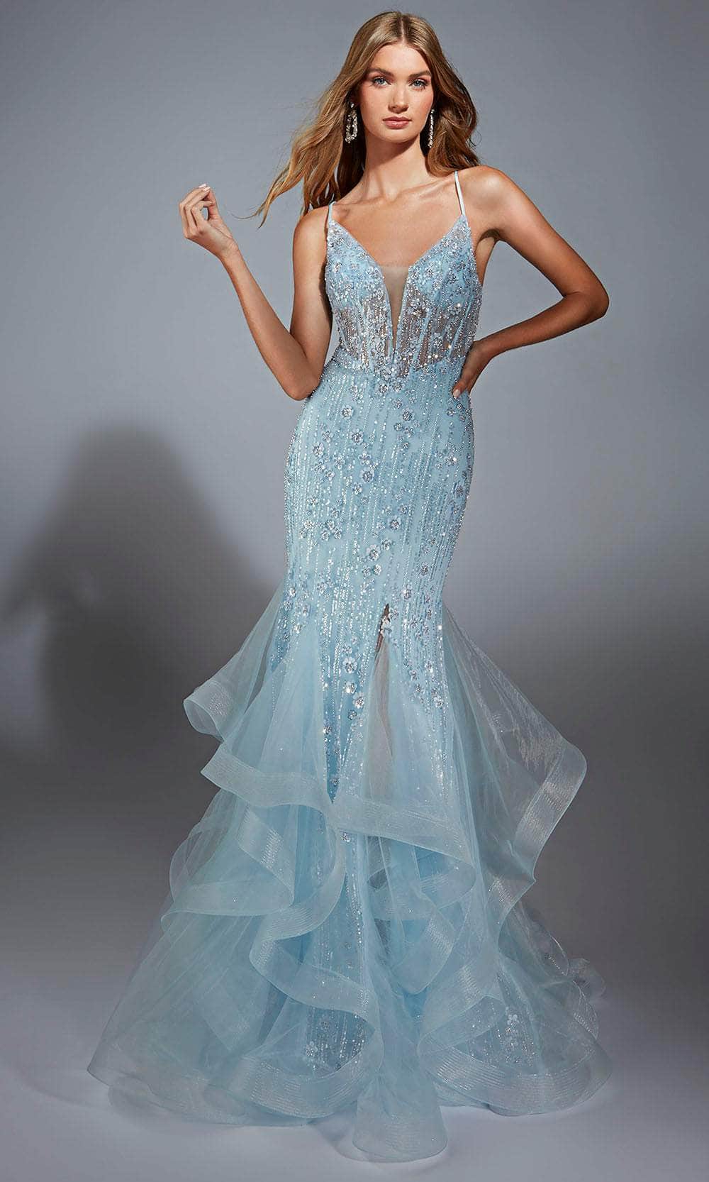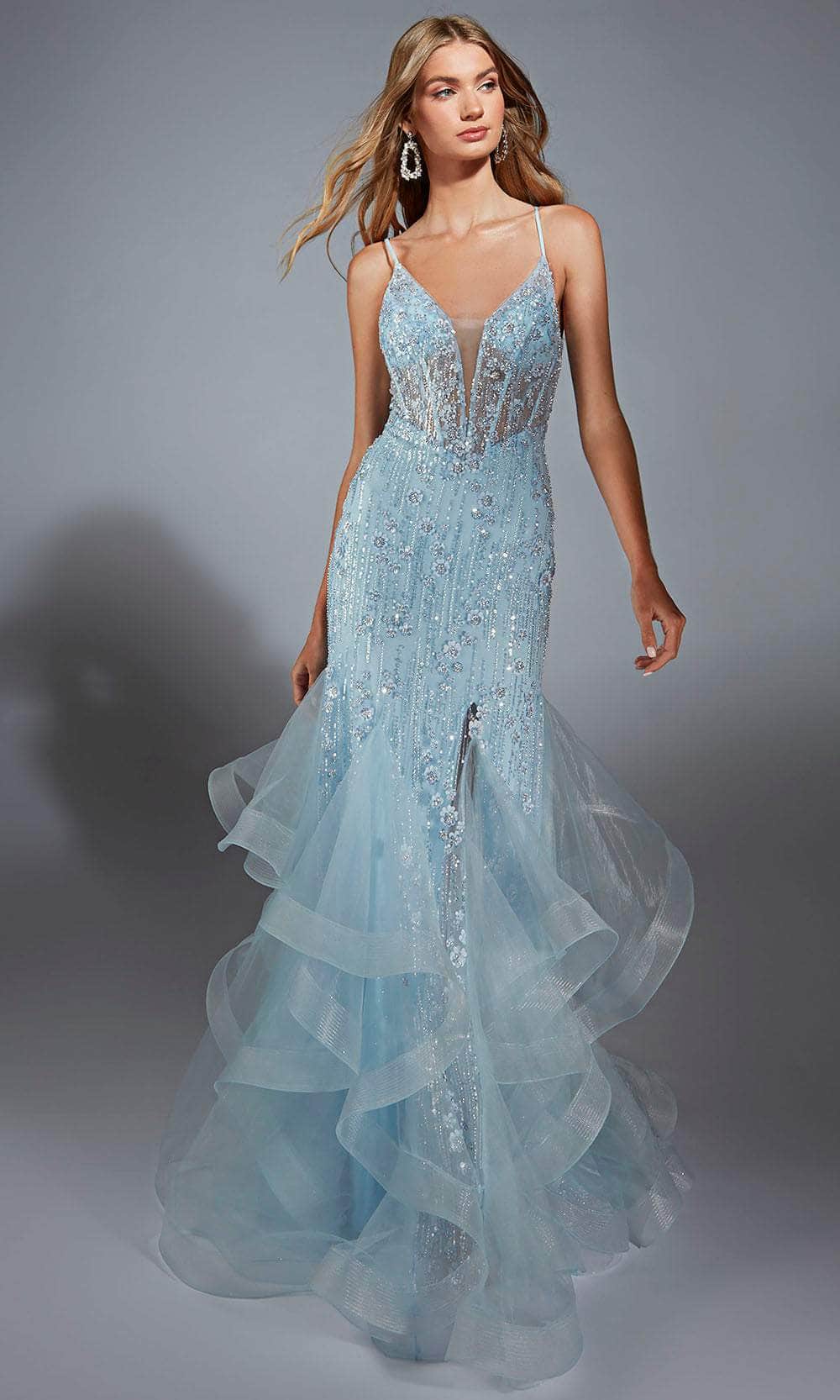 Unveil your inner diva in the Alyce Paris 61749, a sleeveless gown designed for the spotlight. The plunging V-neckline and sheer bodice create a captivating appeal, while the layered skirt and train add a dramatic finish. Embellished with 3D floral appliques and beaded for a luminous effect, this gown is perfect for those who want to leave a lasting impression. Elevate your evening ensemble with the Alyce Paris 61749 and command attention effortlessly. Model is wearing Light Blue color.