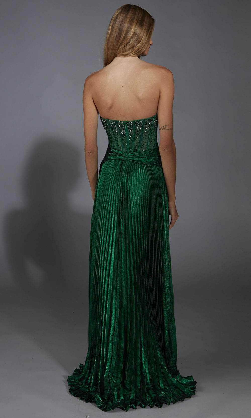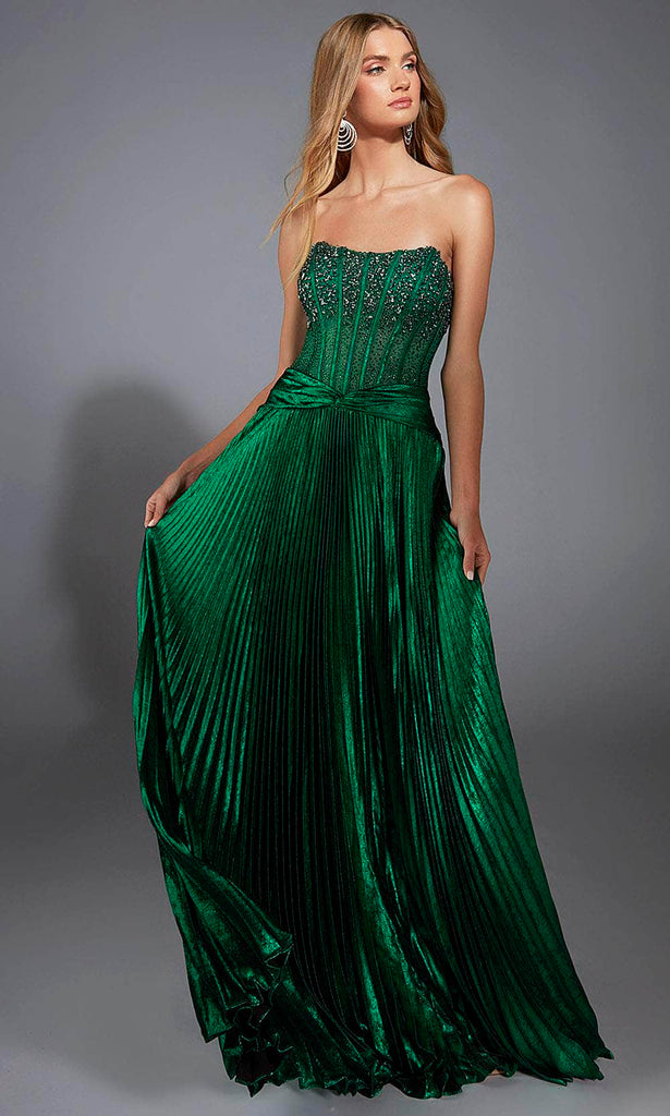 Step into the spotlight with unmatched grace in the Alyce Paris 61789 gown. Crafted from metallic foil, this strapless A-line design captivates with pleated textures and a sheer corset bodice adorned in radiant beadwork. The scoop neckline and open back strike a perfect balance between daring and elegance. Whether it’s a milestone event or a red carpet appearance, this gown blends timeless glamour with modern appeal, ensuring you're unforgettable from every angle.
