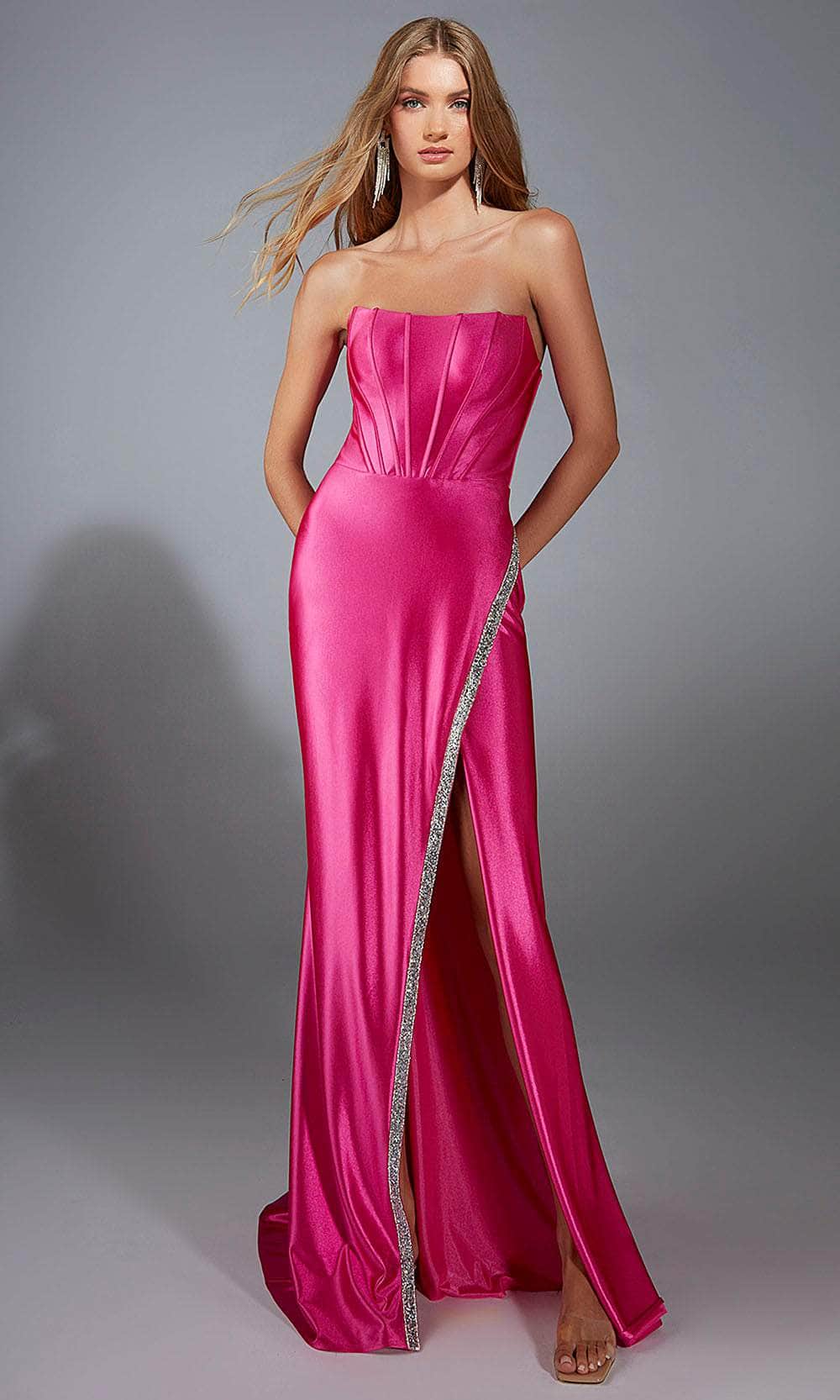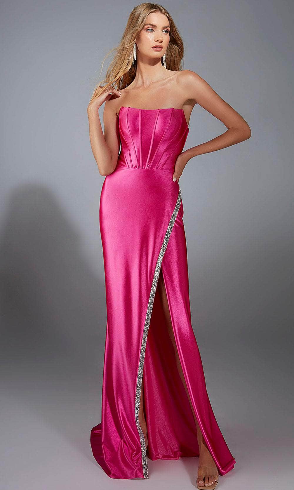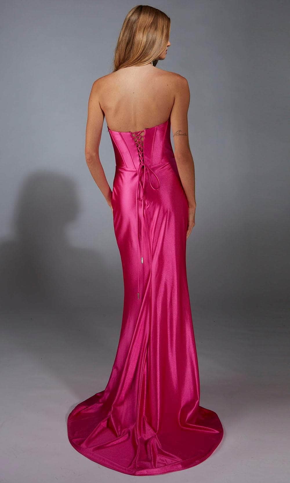 The Alyce Paris 61790 offers a modern twist on classic elegance with its smooth satin finish and sparkling crystal trim. This strapless sheath gown features a structured bodice that accentuates the waist, while the daring thigh-high slit adds an element of allure. Whether you are attending a prom or a formal occasion, this gown delivers sophistication and style. Elevate your wardrobe with the Alyce Paris 61790, crafted for the woman who loves refined luxury. Model is wearing Barbie Pink/Silver color.