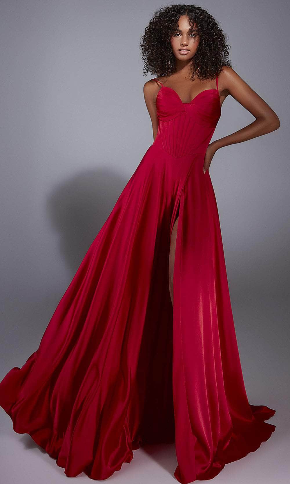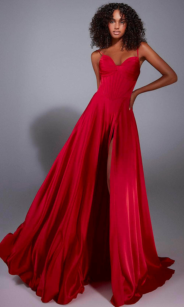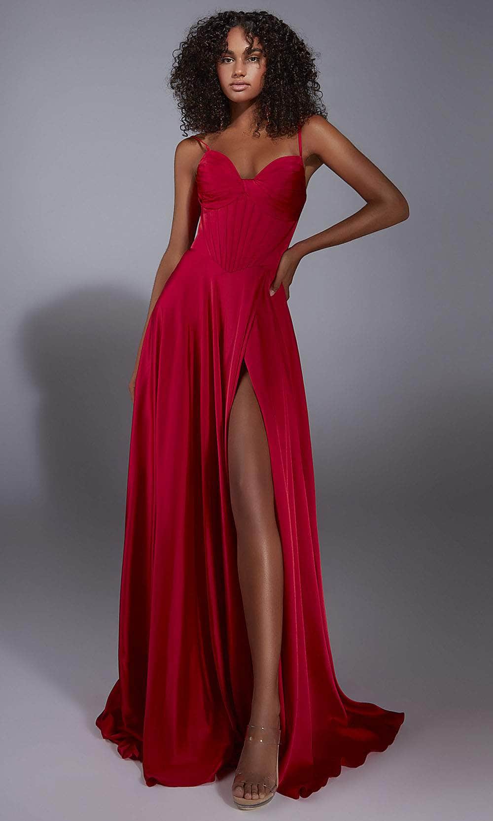 Fall in love with this glamorous design from Alyce Paris 61828. This satin gown features a structured corset bodice that enhances the figure while providing elegant support. Delicate spaghetti straps add a refined touch, complementing the sweetheart neckline for a romantic appeal. The flowing A-line skirt streams effortlessly to the floor, enhanced by a daring high slit that allows for graceful movement. Elevate your wardrobe with the Alyce Paris 61828 and experience effortless sophistication. Model is wearing Claret color.