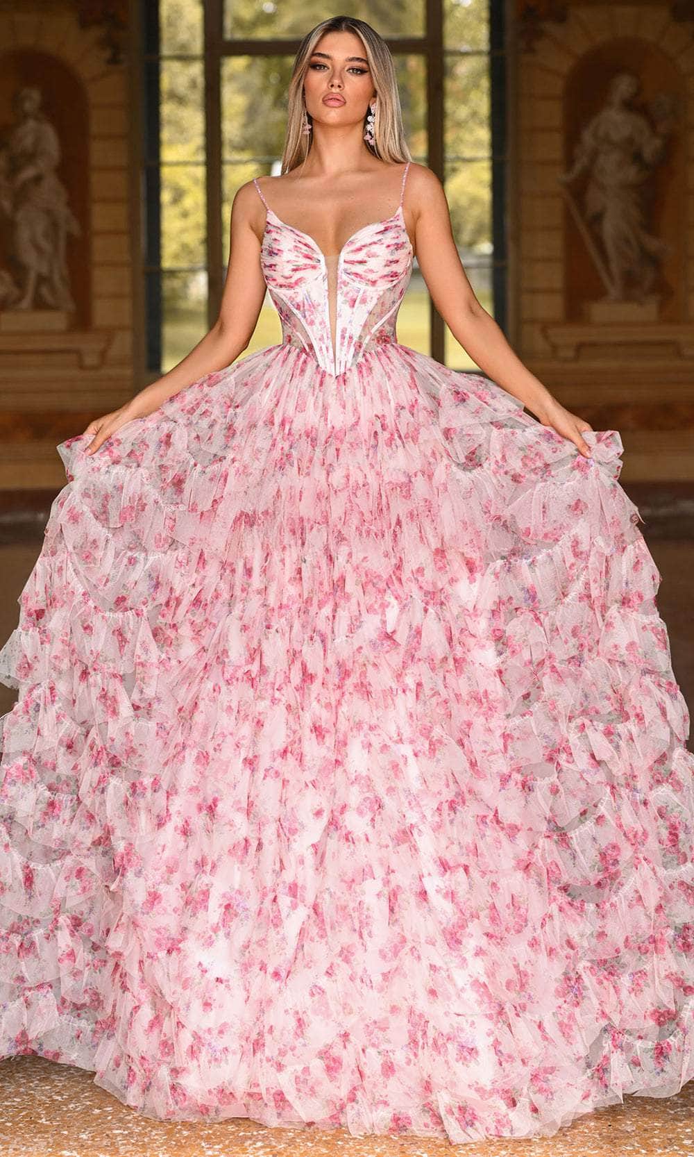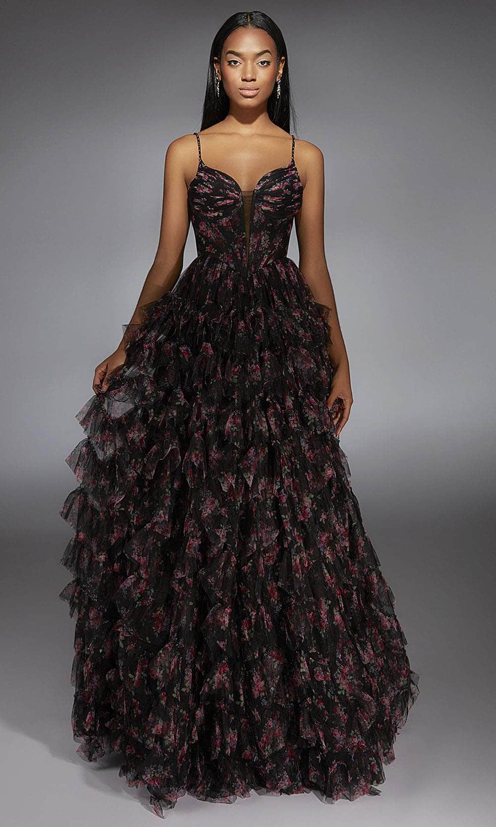 Indulge in regal elegance with this Alyce Paris 61866 ballgown, perfect for making unforgettable memories. The structured bodice accentuates the silhouette, while the tiered ruffle skirt cascades in dreamy layers of floral printed mesh. With a plunging v-neckline and open lace-up back, this gown embodies romance and sophistication, making it perfect for a grand celebration. Command attention at your next event with the Alyce Paris 61866, a show-stopping piece crafted for unforgettable moments. Models are wearing Black/Pink, and Pink colors.