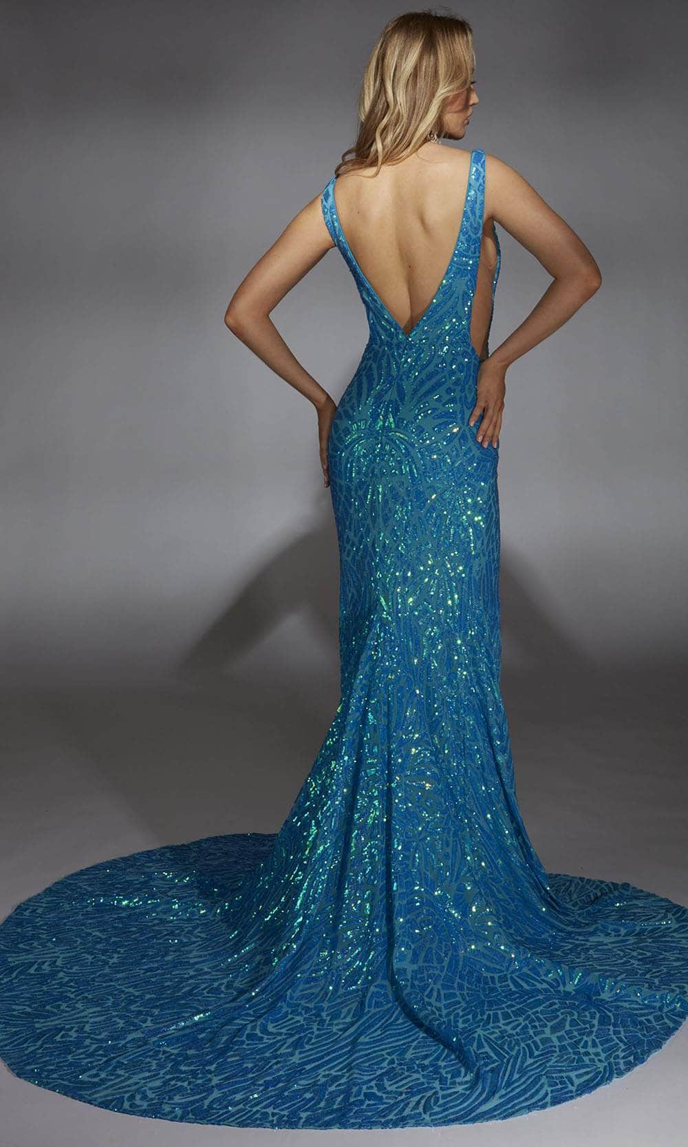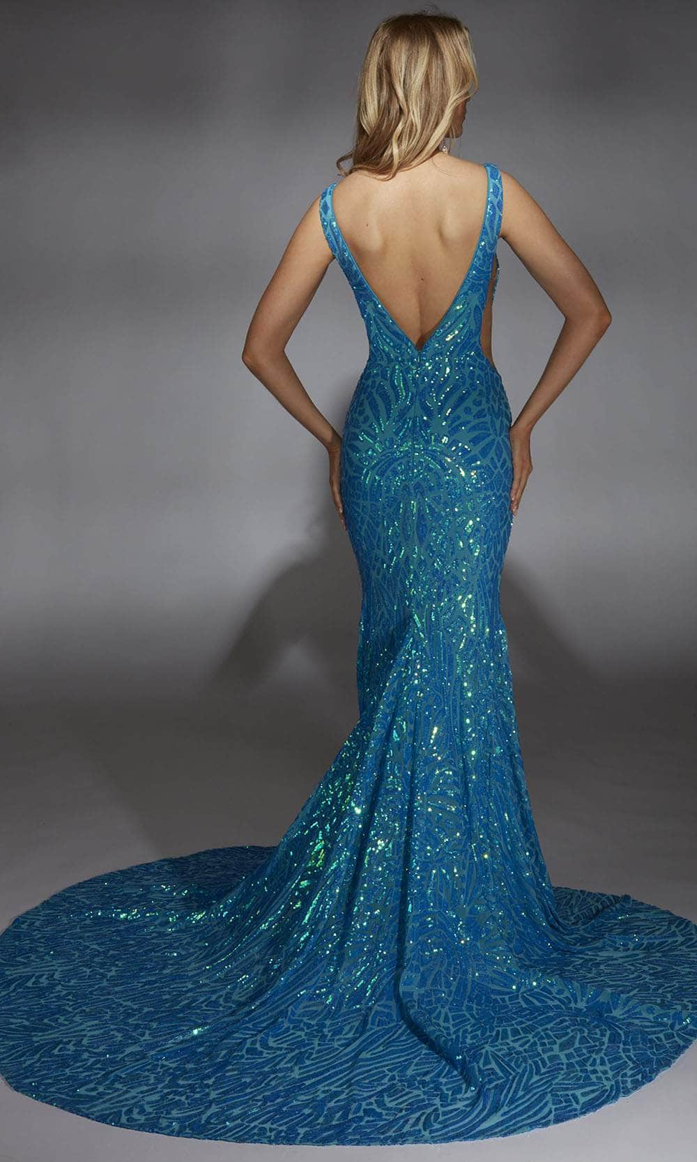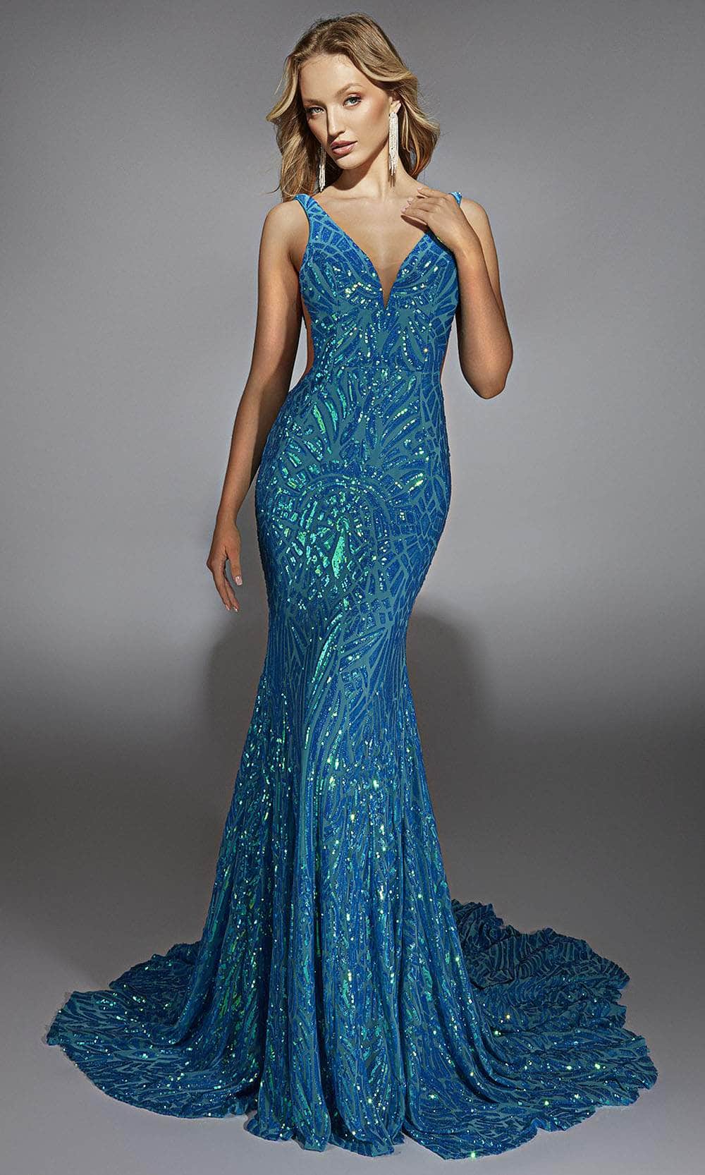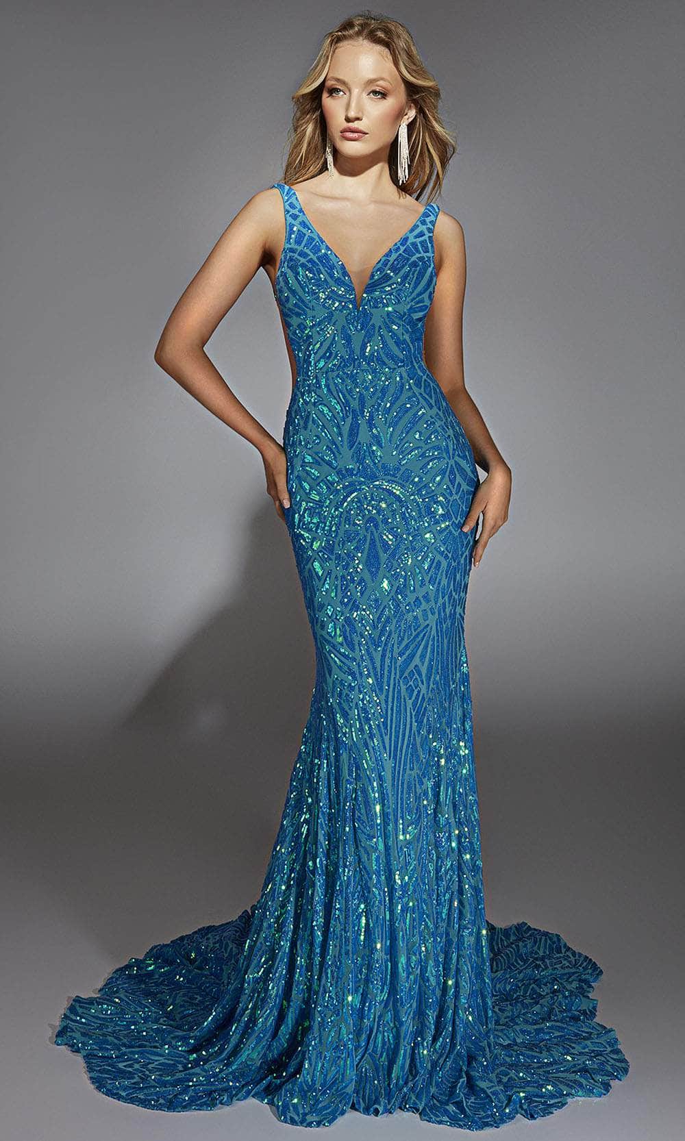 Make an entrance in the Alyce Paris 61876, a mesmerizing gown adorned with geometric pattern of sequin. This stunning design features a deep V-neckline and a sheer sides waist, sculpting a flattering silhouette that flares into a sheath skirt. The fitted bodice hugs your curves perfectly, while the sweep train adds an extra layer of sophistication and drama. A dazzling choice for galas, prom, or any special occasion, the Alyce Paris 61876 masterpiece is sure to leave a lasting impression. Model is wearing Ocean color.