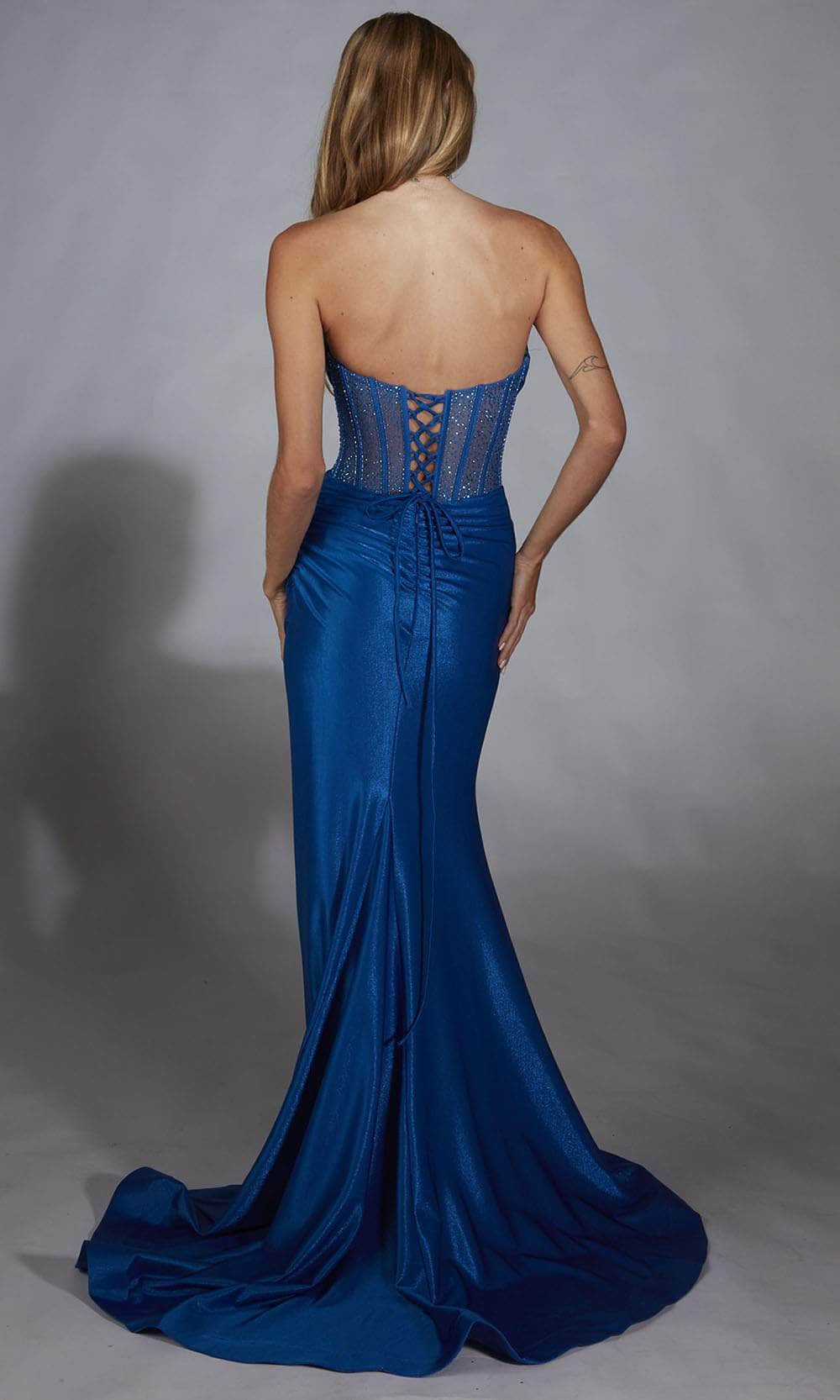 | Details: | Strapless, Beaded Corset Bodice, Ruched Waist, Thigh Slit |